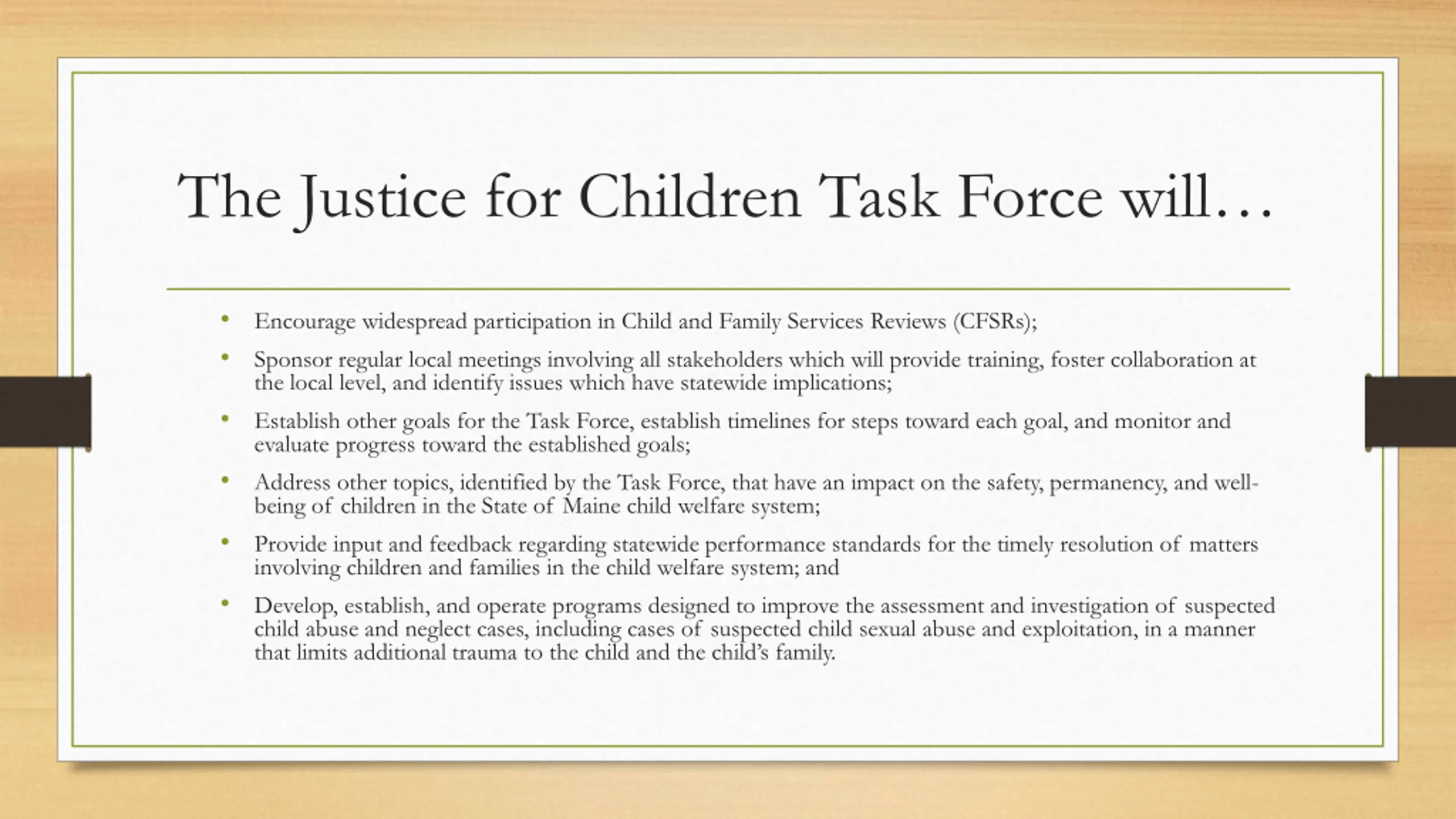 The Justice for Children Task Force will Encourage widespread participation in Child and Family Services Reviews (CFSRs); Sponsor regular local meetings involving all stakeholders which will provide training, foster collaboration at the local level, and identify issues which have statewide implications; Establish other goals for the Task Force, establish timelines for steps toward each goal, and monitor and evaluate progress toward the established goals; Address other topics, identified by the Task Force, that have an impact on the safety, permanency, and well- being of children in the State of Maine child welfare system; Provide input and feedback regarding statewide performance standards for the timely resolution of matters involving children and families in the child welfare system; and Develop, establish, and operate programs designed to improve the assessment and investigation of suspected child abuse and neglect cases, including cases of suspected child sexual abuse and exploitation, in a manner that limits additional trauma to the child and the child s family.