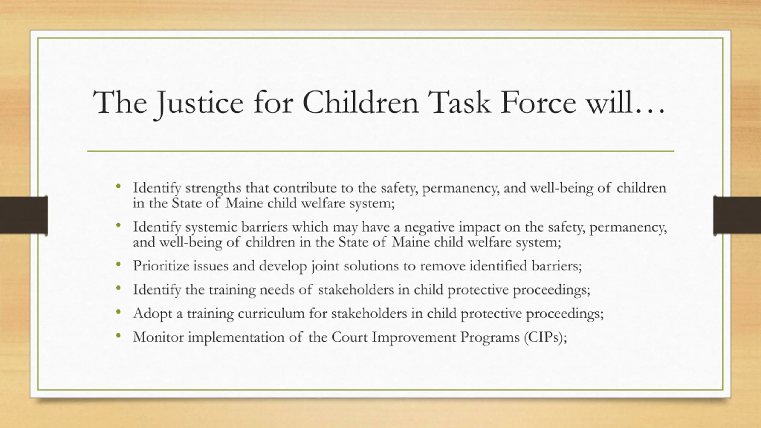 The Justice for Children Task Force will Identify strengths that contribute to the safety, permanency, and well-being of children in the State of Maine child welfare system; Identify systemic barriers which may have a negative impact on the safety, permanency, and well-being of children in the State of Maine child welfare system; Prioritize issues and develop joint solutions to remove identified barriers; Identify the training needs of stakeholders in child protective proceedings; Adopt a training curriculum for stakeholders in child protective proceedings; Monitor implementation of the Court Improvement Programs (CIPs);