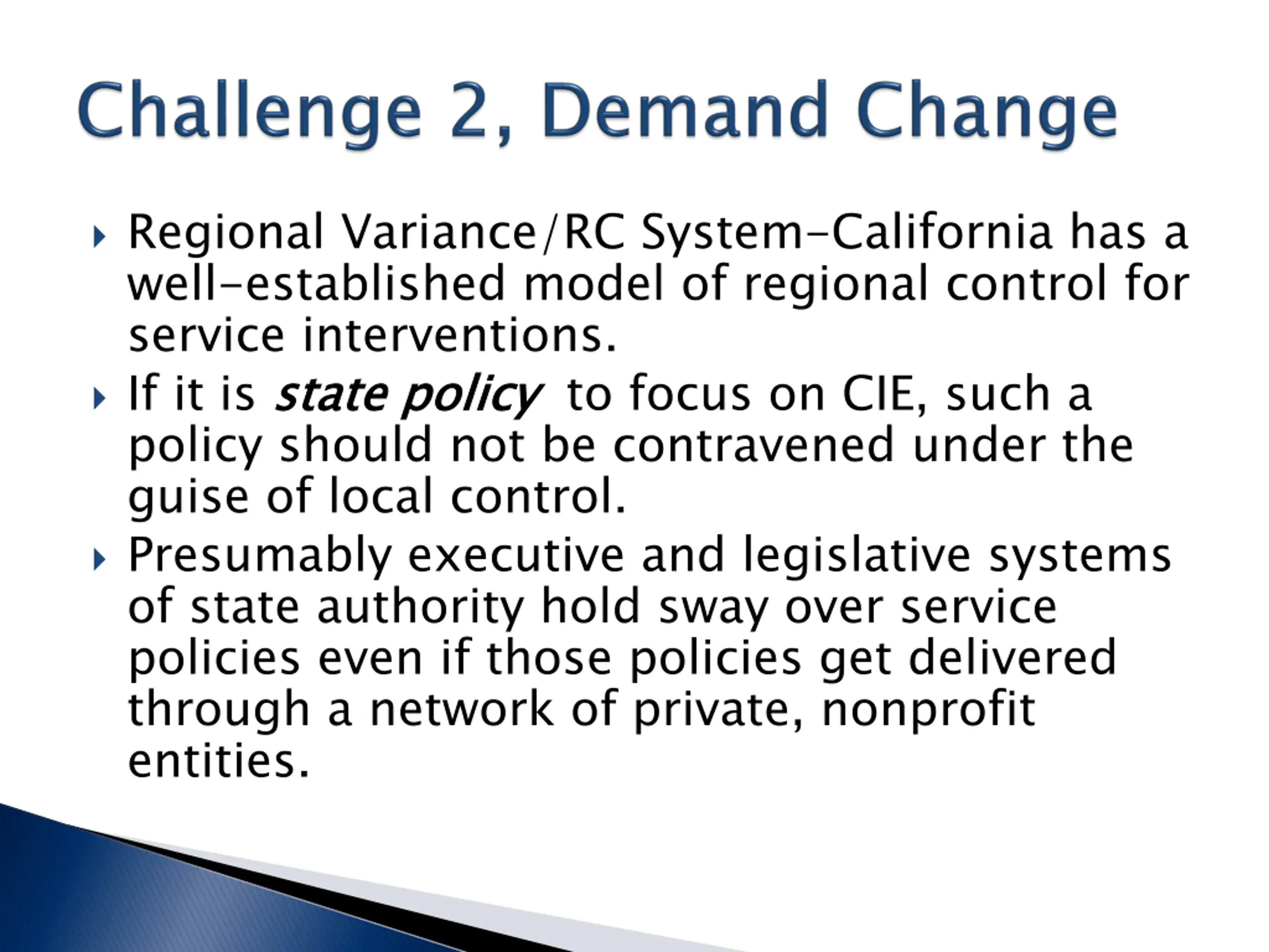 Regional Variance/RC System-California has a well-established model of regional control for service interventions. If it is state policy policy should not be contravened under the guise of local control. Presumably executive and legislative systems of state authority hold sway over service policies even if those policies get delivered through a network of private, nonprofit entities. state policy to focus on CIE, such a