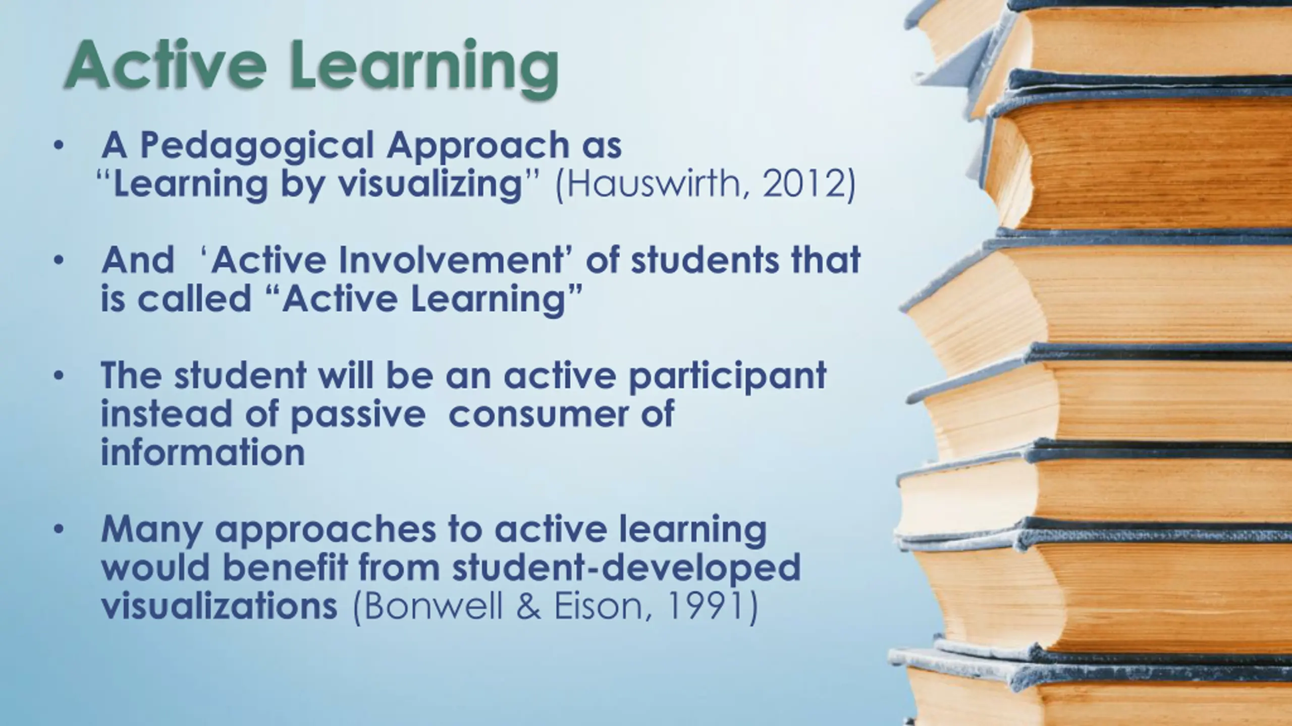 Active Learning A Pedagogical Approach as Learning by visualizing (Hauswirth, 2012) And Active Involvement of students that is called Active Learning The student will be an active participant instead of passive consumer of information Many approaches to active learning would benefit from student-developed visualizations (Bonwell & Eison, 1991)