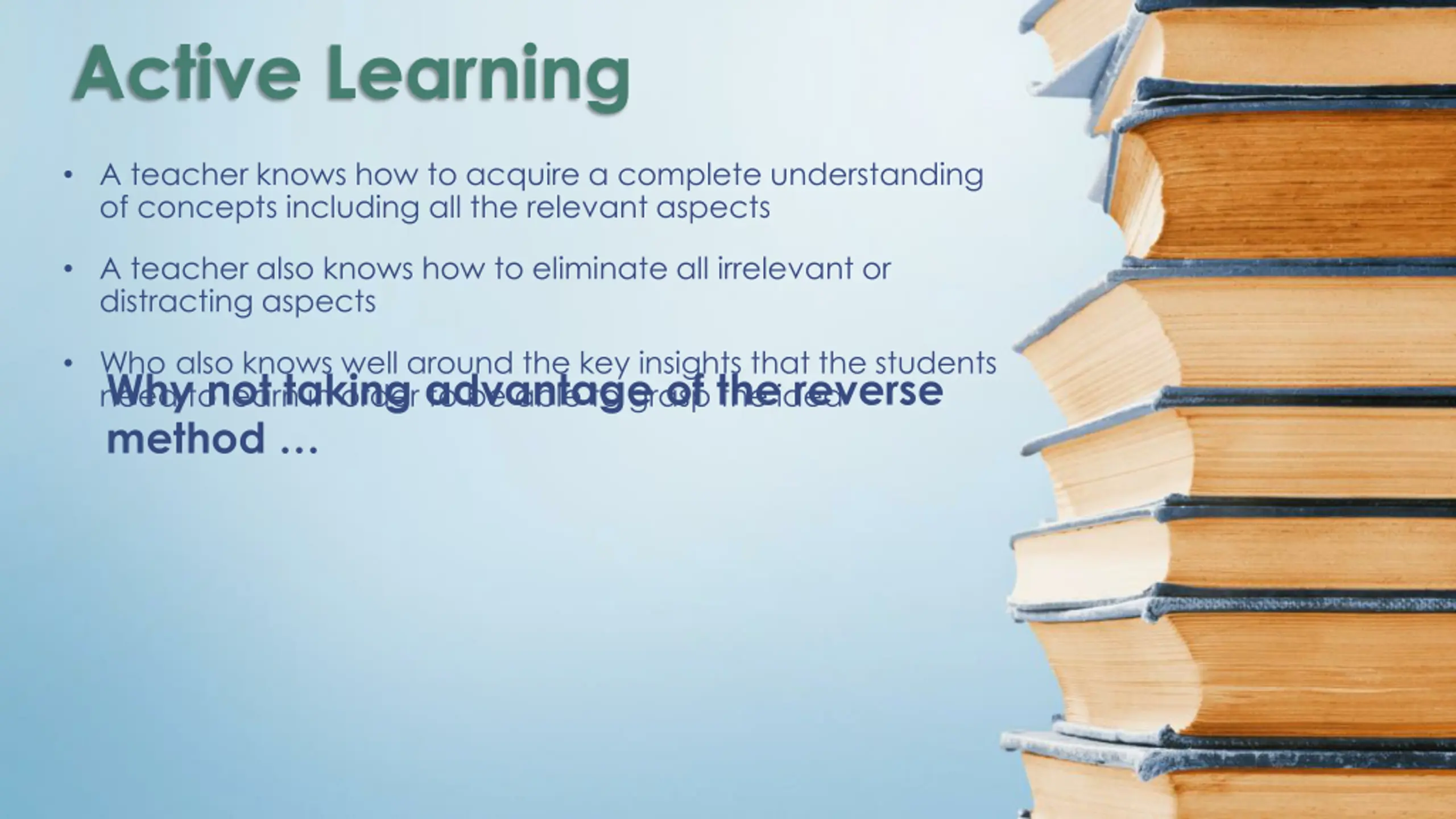Active Learning A teacher knows how to acquire a complete understanding of concepts including all the relevant aspects A teacher also knows how to eliminate all irrelevant or distracting aspects Who also knows well around the key insights that the students need to learn in order to be able to grasp the idea Why not taking advantage of the reverse method