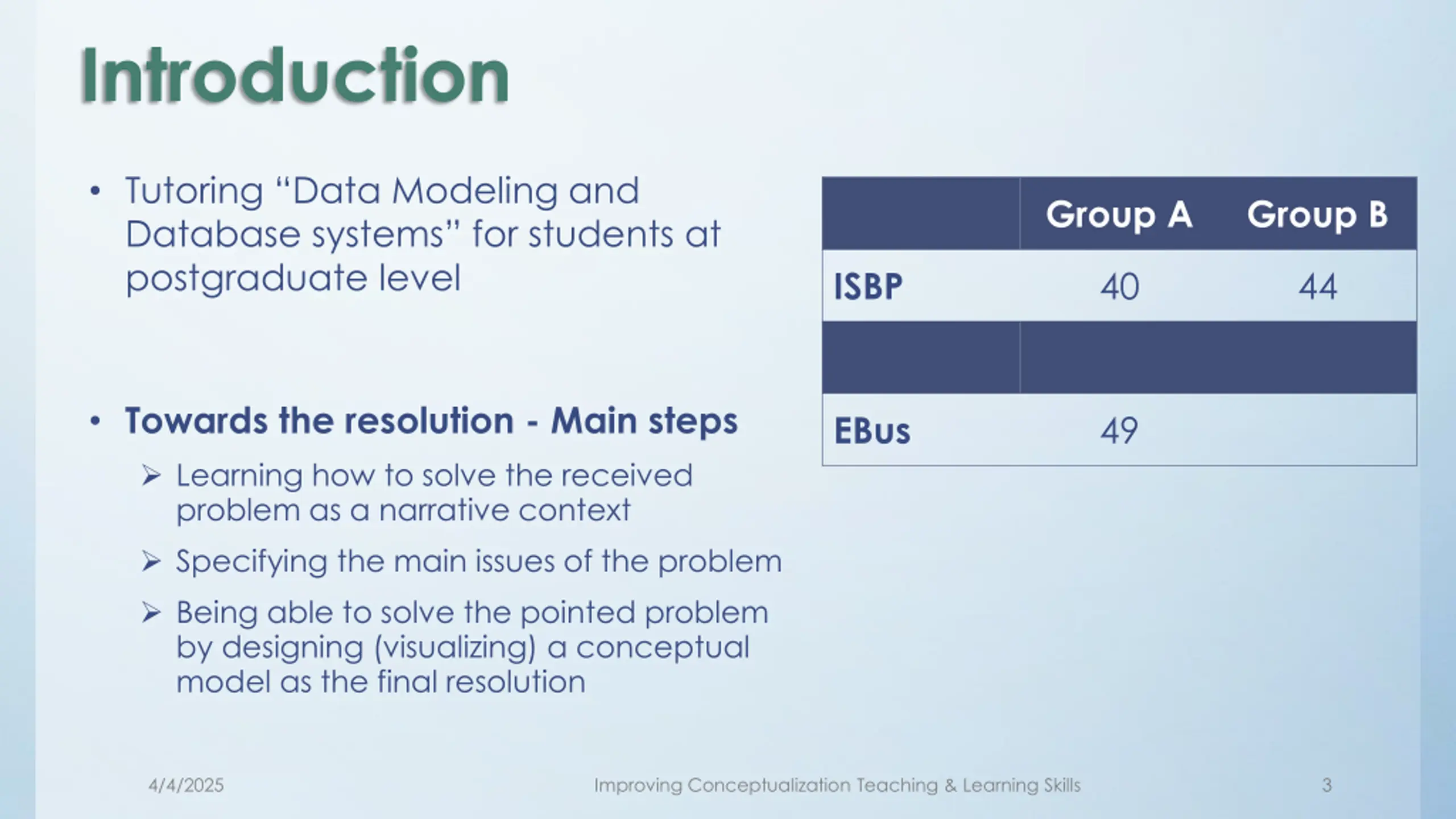 Introduction Tutoring Data Modeling and Database systems for students at postgraduate level Group A Group B ISBP 40 44 Towards the resolution - Main steps Learning how to solve the received problem as a narrative context Specifying the main issues of the problem Being able to solve the pointed problem by designing (visualizing) a conceptual model as the final resolution EBus 49 4/4/2025 Improving Conceptualization Teaching & Learning Skills 3