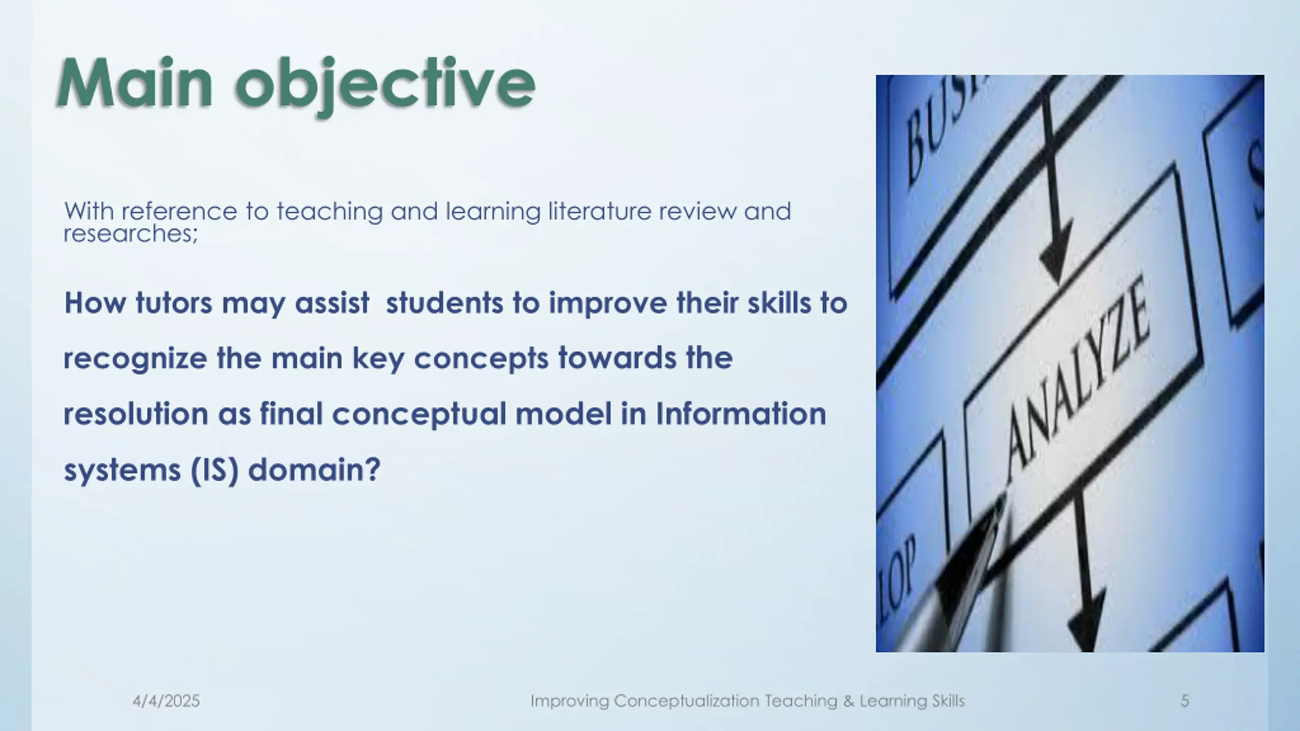 Main objective With reference to teaching and learning literature review and researches; How tutors may assist students to improve their skills to recognize the main key concepts towards the resolution as final conceptual model in Information systems (IS) domain? 4/4/2025 Improving Conceptualization Teaching & Learning Skills 5