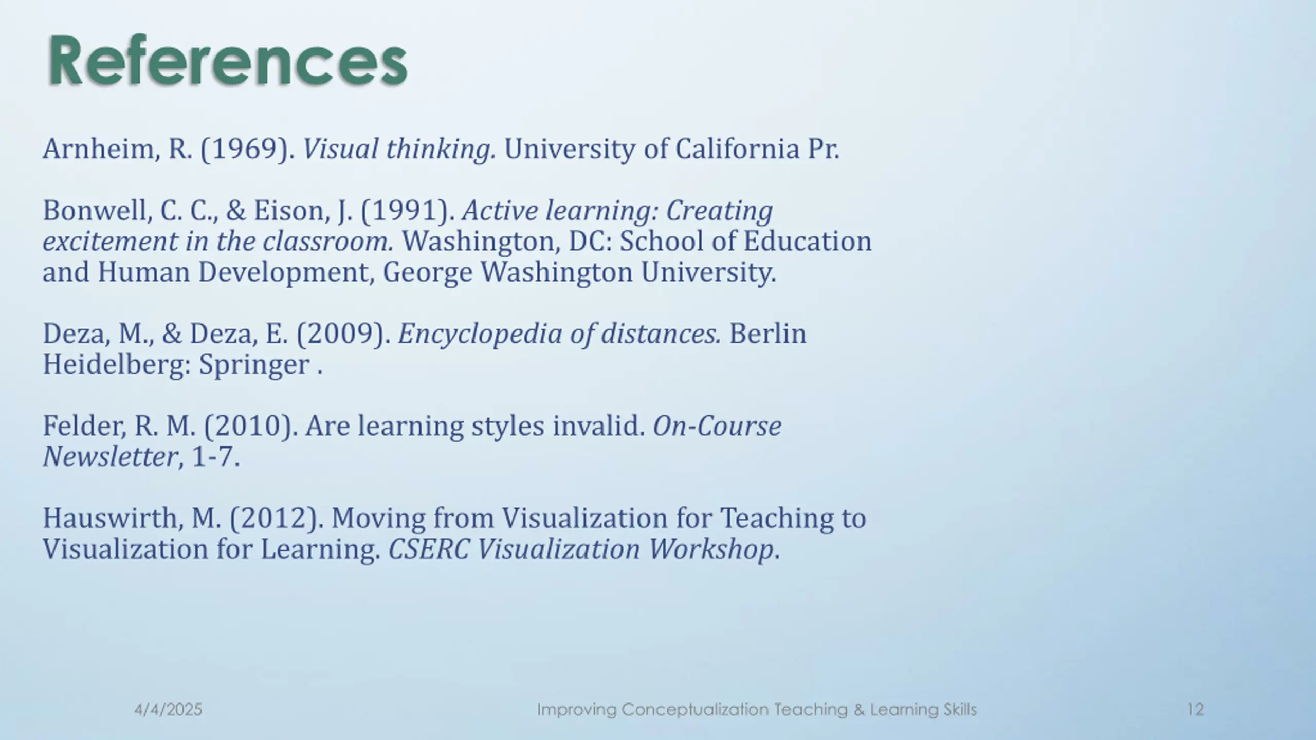 References Arnheim, R. (1969). Visual thinking. University of California Pr. Bonwell, C. C., & Eison, J. (1991). Active learning: Creating excitement in the classroom. Washington, DC: School of Education and Human Development, George Washington University. Deza, M., & Deza, E. (2009). Encyclopedia of distances. Berlin Heidelberg: Springer . Felder, R. M. (2010). Are learning styles invalid. On-Course Newsletter, 1-7. Hauswirth, M. (2012). Moving from Visualization for Teaching to Visualization for Learning. CSERC Visualization Workshop. 4/4/2025 Improving Conceptualization Teaching & Learning Skills 12