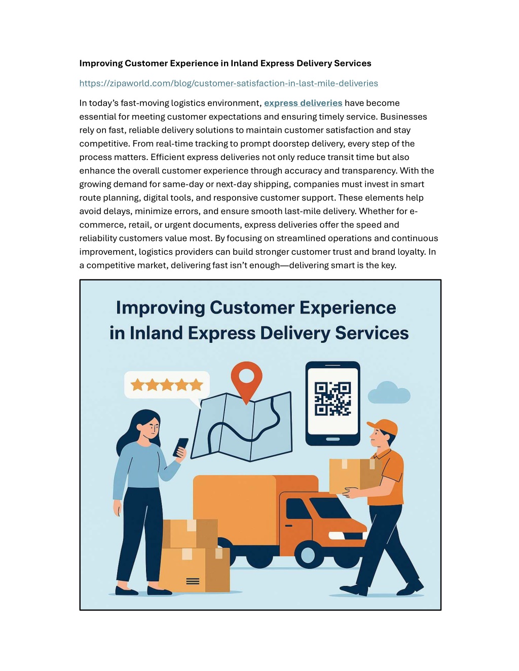 Improving Customer Experience in Inland Express Delivery Services https://zipaworld.com/blog/customer-satisfaction-in-last-mile-deliveries In today s fast-moving logistics environment, express deliveries have become essential for meeting customer expectations and ensuring timely service. Businesses rely on fast, reliable delivery solutions to maintain customer satisfaction and stay competitive. From real-time tracking to prompt doorstep delivery, every step of the process matters. E?icient express deliveries not only reduce transit time but also enhance the overall customer experience through accuracy and transparency. With the growing demand for same-day or next-day shipping, companies must invest in smart route planning, digital tools, and responsive customer support. These elements help avoid delays, minimize errors, and ensure smooth last-mile delivery. Whether for e- commerce, retail, or urgent documents, express deliveries o?er the speed and reliability customers value most. By focusing on streamlined operations and continuous improvement, logistics providers can build stronger customer trust and brand loyalty. In a competitive market, delivering fast isn t enough delivering smart is the key.