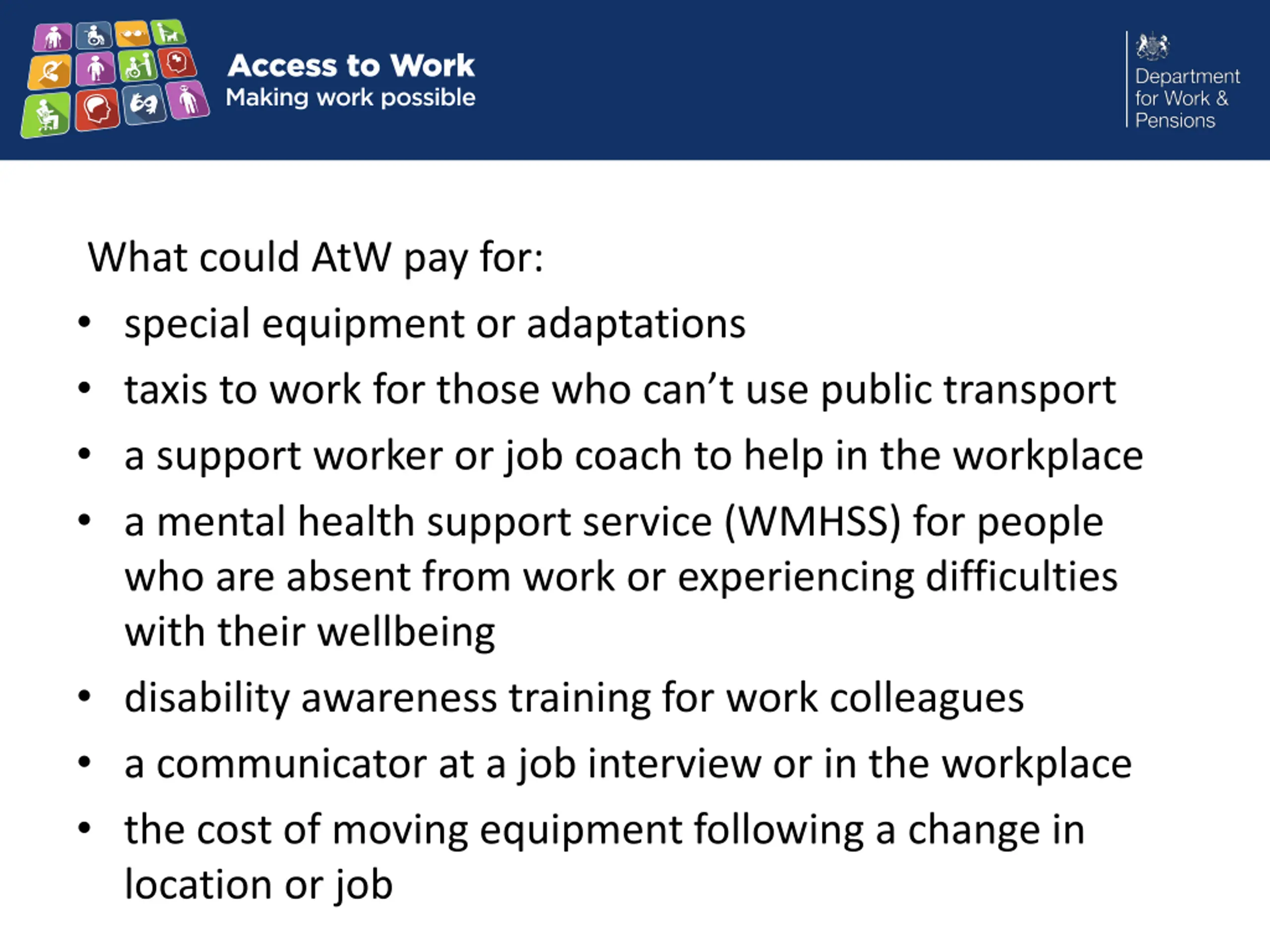 What could AtW pay for: special equipment or adaptations taxis to work for those who can t use public transport a support worker or job coach to help in the workplace a mental health support service (WMHSS) for people who are absent from work or experiencing difficulties with their wellbeing disability awareness training for work colleagues a communicator at a job interview or in the workplace the cost of moving equipment following a change in location or job