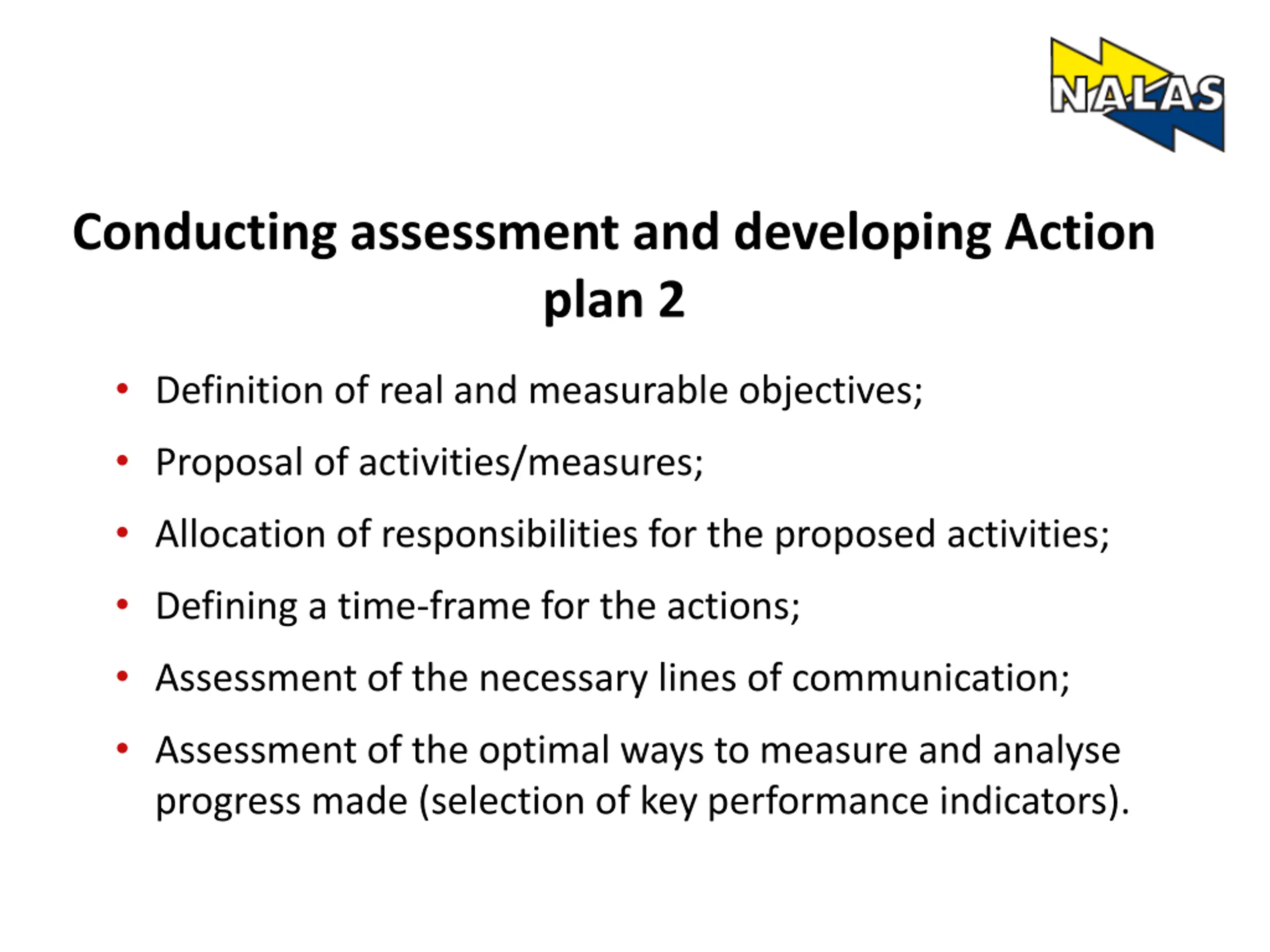 Conducting assessment and developing Action plan 2 Definition of real and measurable objectives; Proposal of activities/measures; Allocation of responsibilities for the proposed activities; Defining a time-frame for the actions; Assessment of the necessary lines of communication; Assessment of the optimal ways to measure and analyse progress made (selection of key performance indicators).