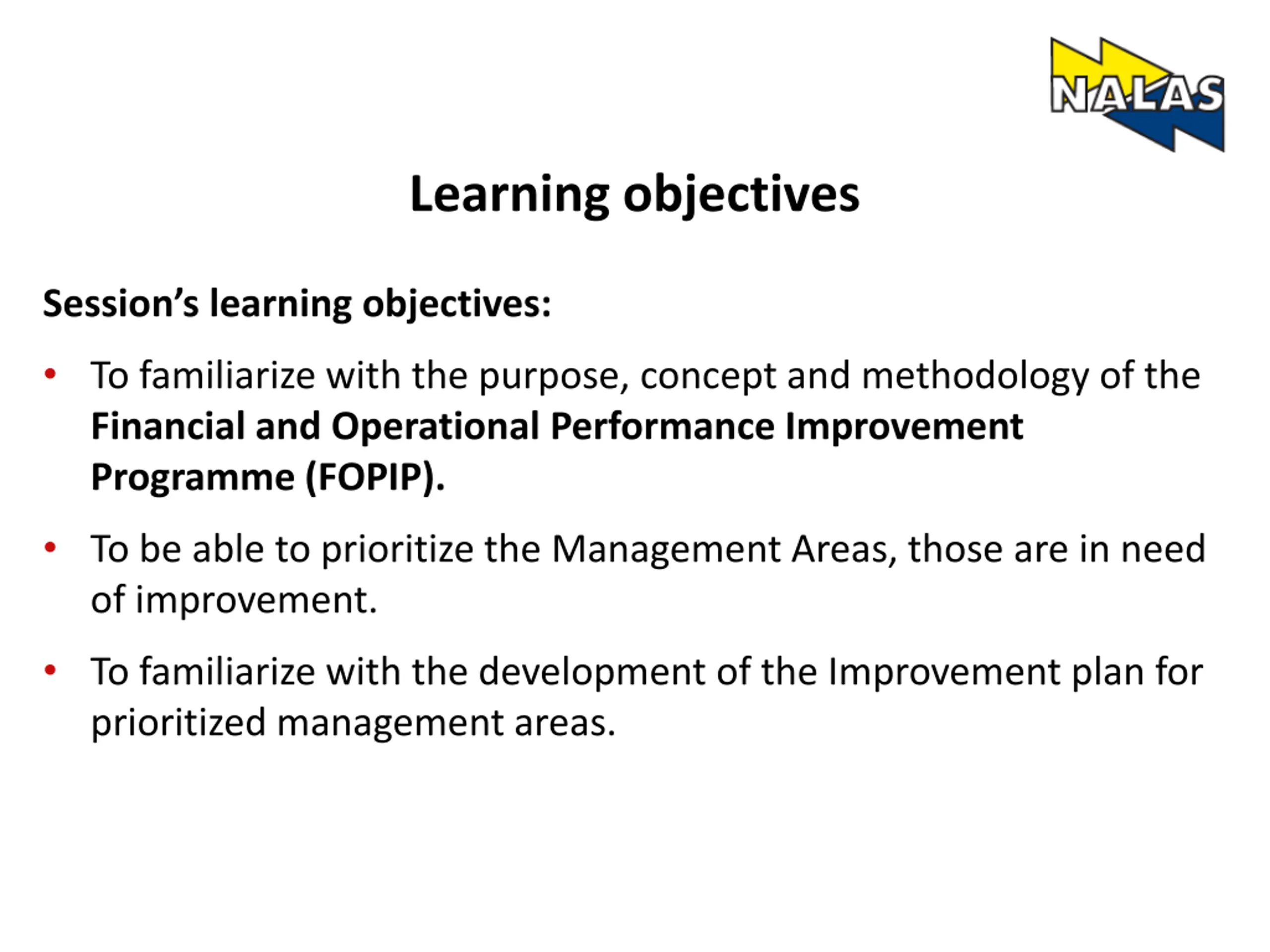 Learning objectives Session s learning objectives: To familiarize with the purpose, concept and methodology of the Financial and Operational Performance Improvement Programme (FOPIP). To be able to prioritize the Management Areas, those are in need of improvement. To familiarize with the development of the Improvement plan for prioritized management areas.