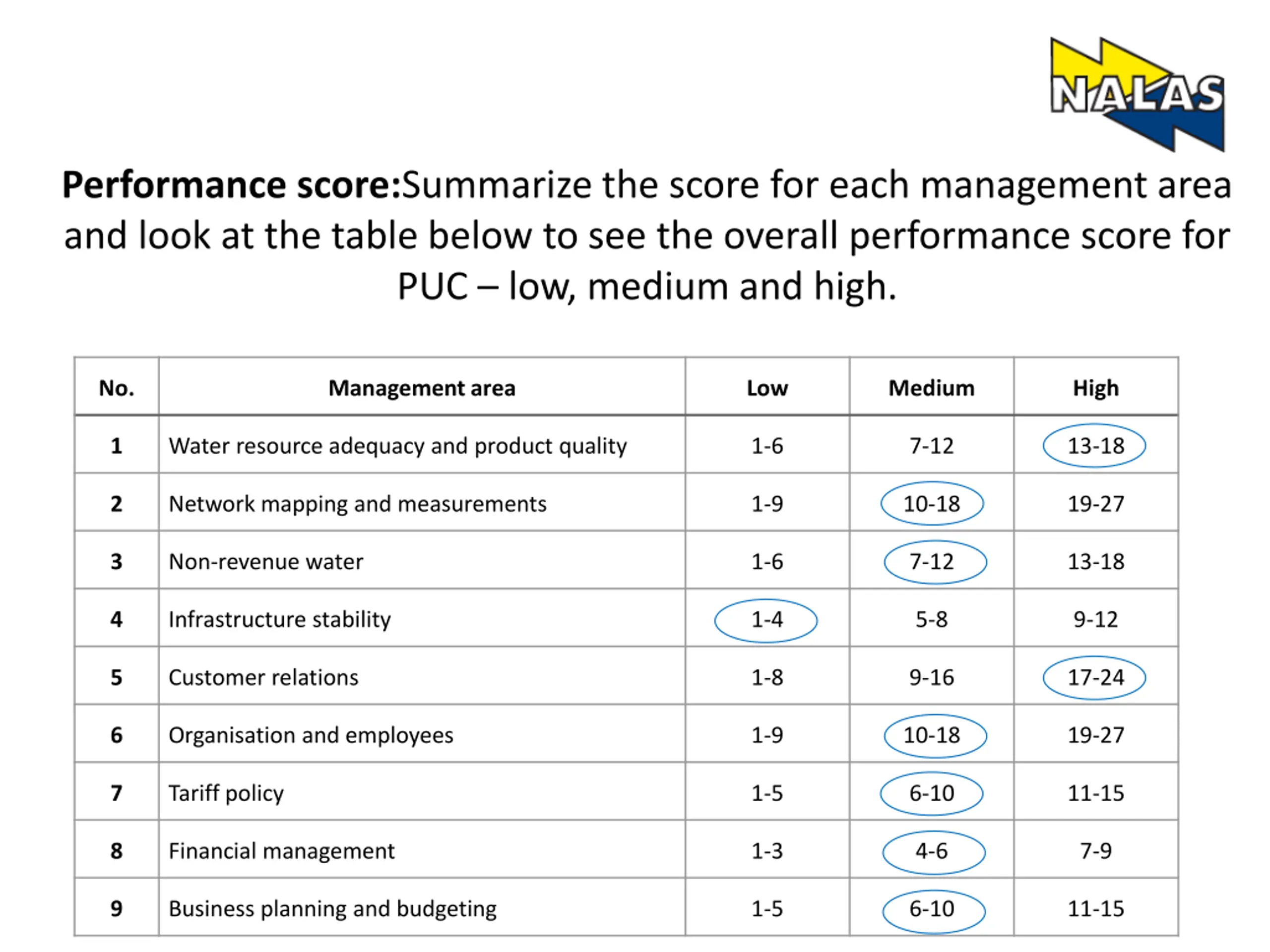 Performance score:Summarize the score for each management area and look at the table below to see the overall performance score for PUC low, medium and high. No. Management area Low Medium High 1 Water resource adequacy and product quality 1-6 7-12 13-18 2 Network mapping and measurements 1-9 10-18 19-27 3 Non-revenue water 1-6 7-12 13-18 4 Infrastructure stability 1-4 5-8 9-12 5 Customer relations 1-8 9-16 17-24 6 Organisation and employees 1-9 10-18 19-27 7 Tariff policy 1-5 6-10 11-15 8 Financial management 1-3 4-6 7-9 9 Business planning and budgeting 1-5 6-10 11-15