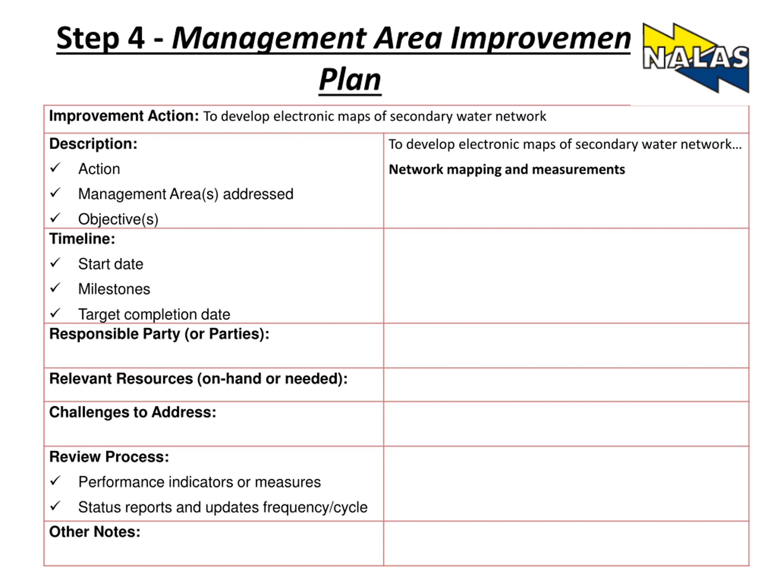 Step 4 - Management Area Improvement Plan Improvement Action: To develop electronic maps of secondary water network Description: Action Management Area(s) addressed Objective(s) Timeline: Start date Milestones Target completion date Responsible Party (or Parties): To develop electronic maps of secondary water network Network mapping and measurements Relevant Resources (on-hand or needed): Challenges to Address: Review Process: Performance indicators or measures Status reports and updates frequency/cycle Other Notes: