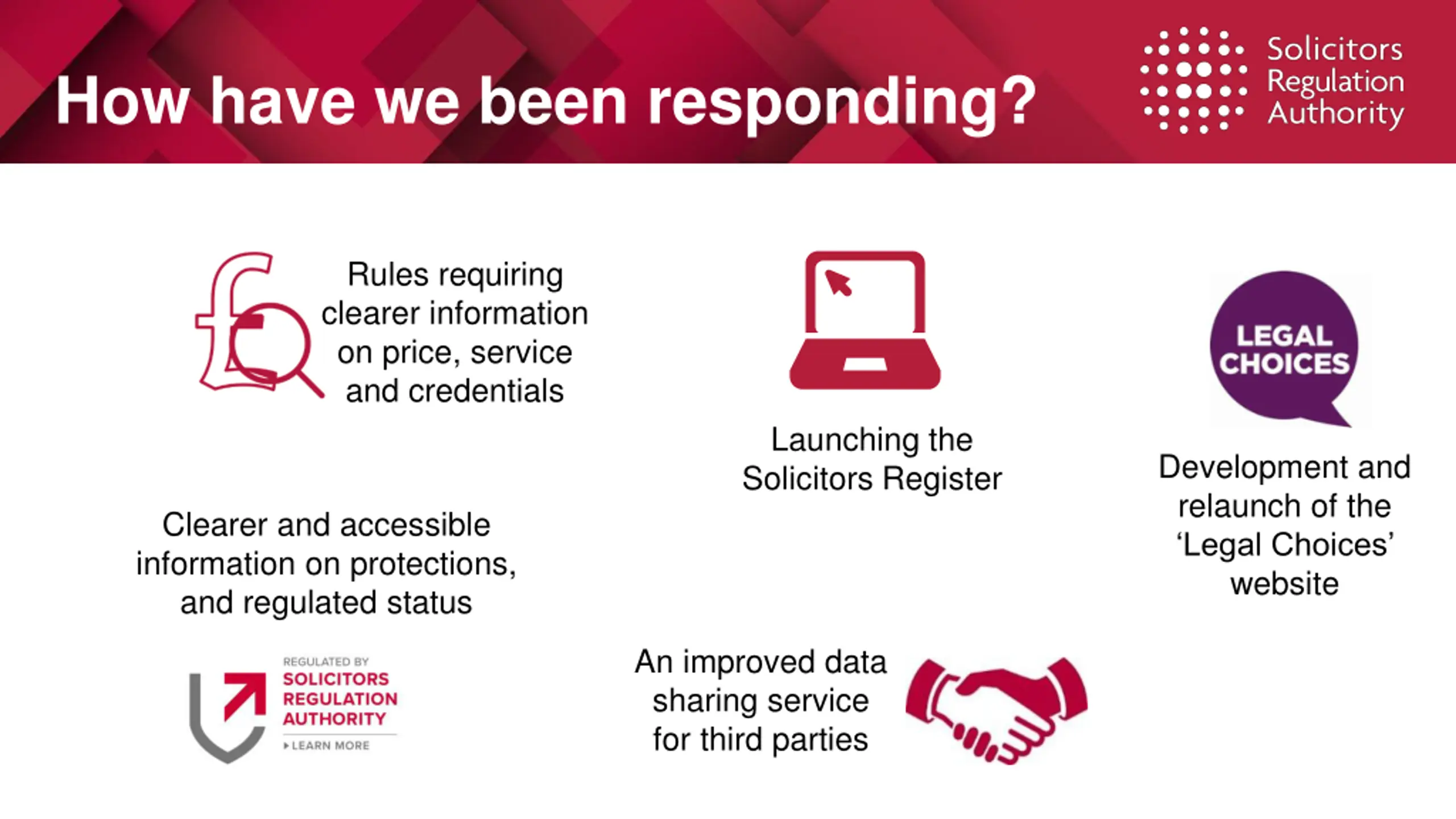 How have we been responding? Rules requiring clearer information on price, service and credentials Launching the Solicitors Register Development and relaunch of the Legal Choices website Clearer and accessible information on protections, and regulated status An improved data sharing service for third parties