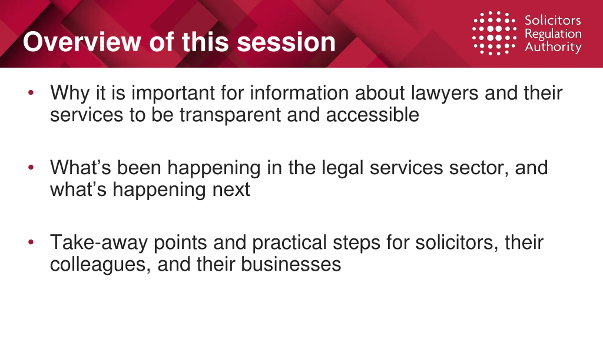 Overview of this session Why it is important for information about lawyers and their services to be transparent and accessible What s been happening in the legal services sector, and what s happening next Take-away points and practical steps for solicitors, their colleagues, and their businesses