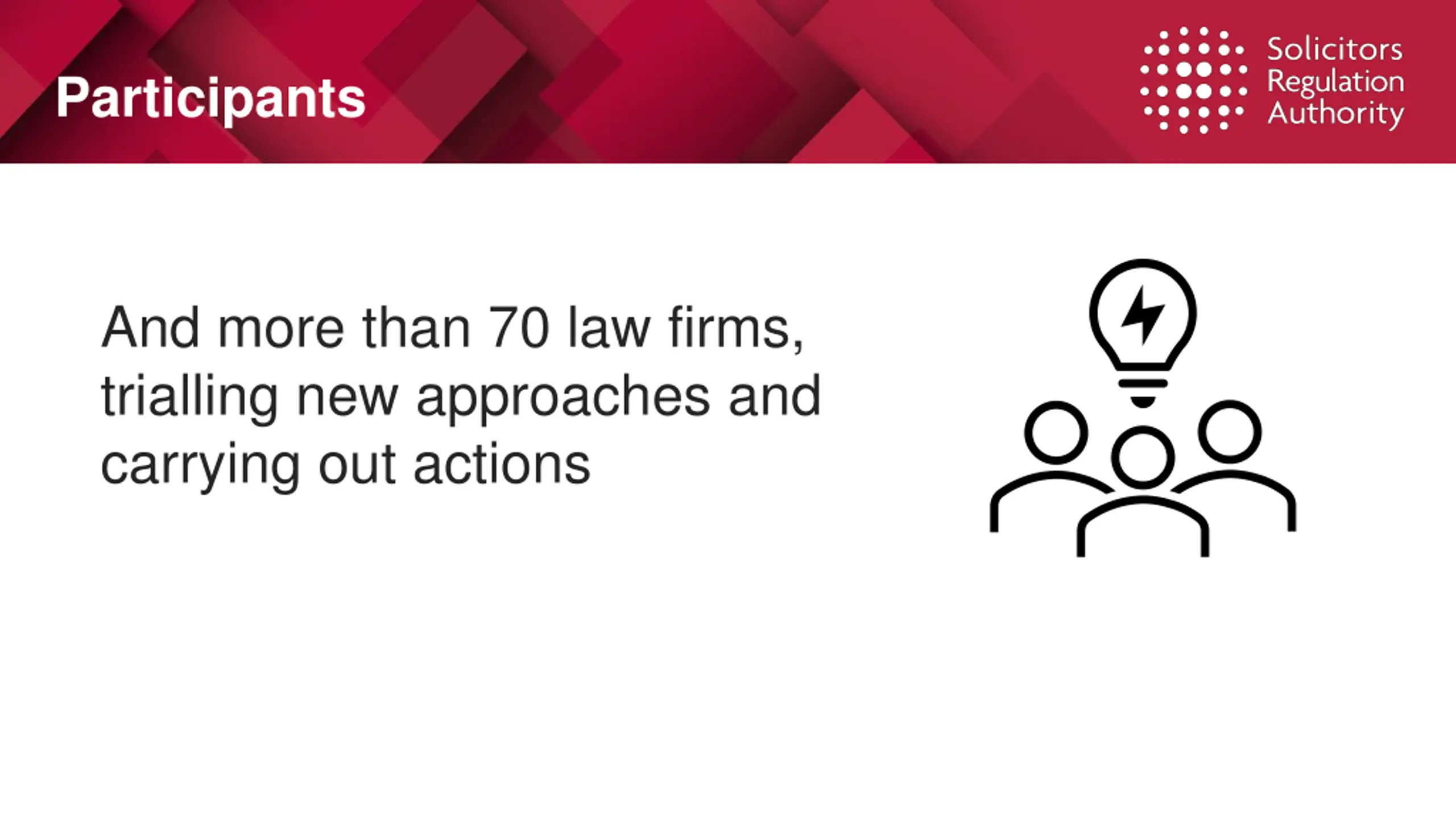 Participants And more than 70 law firms, trialling new approaches and carrying out actions