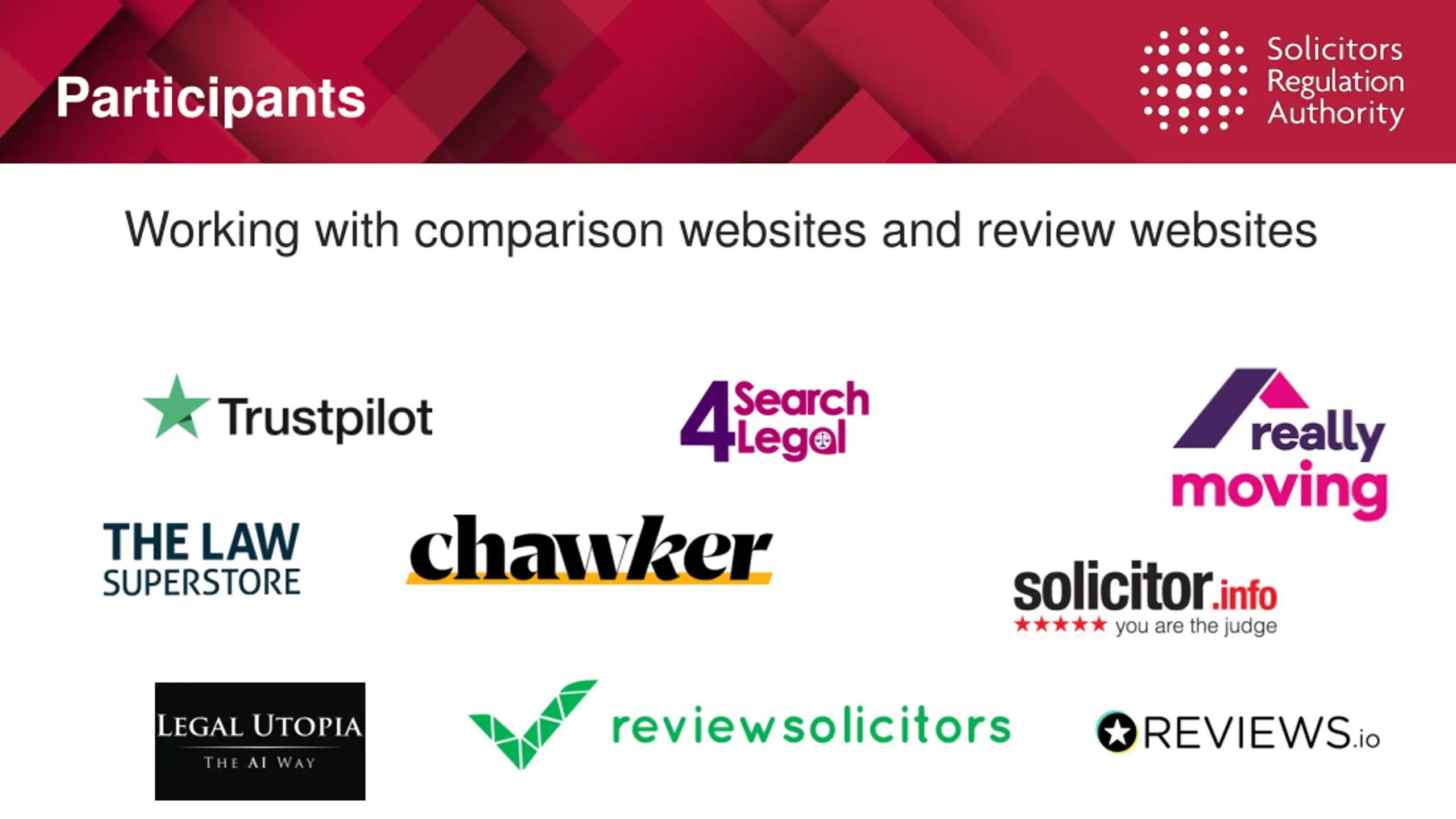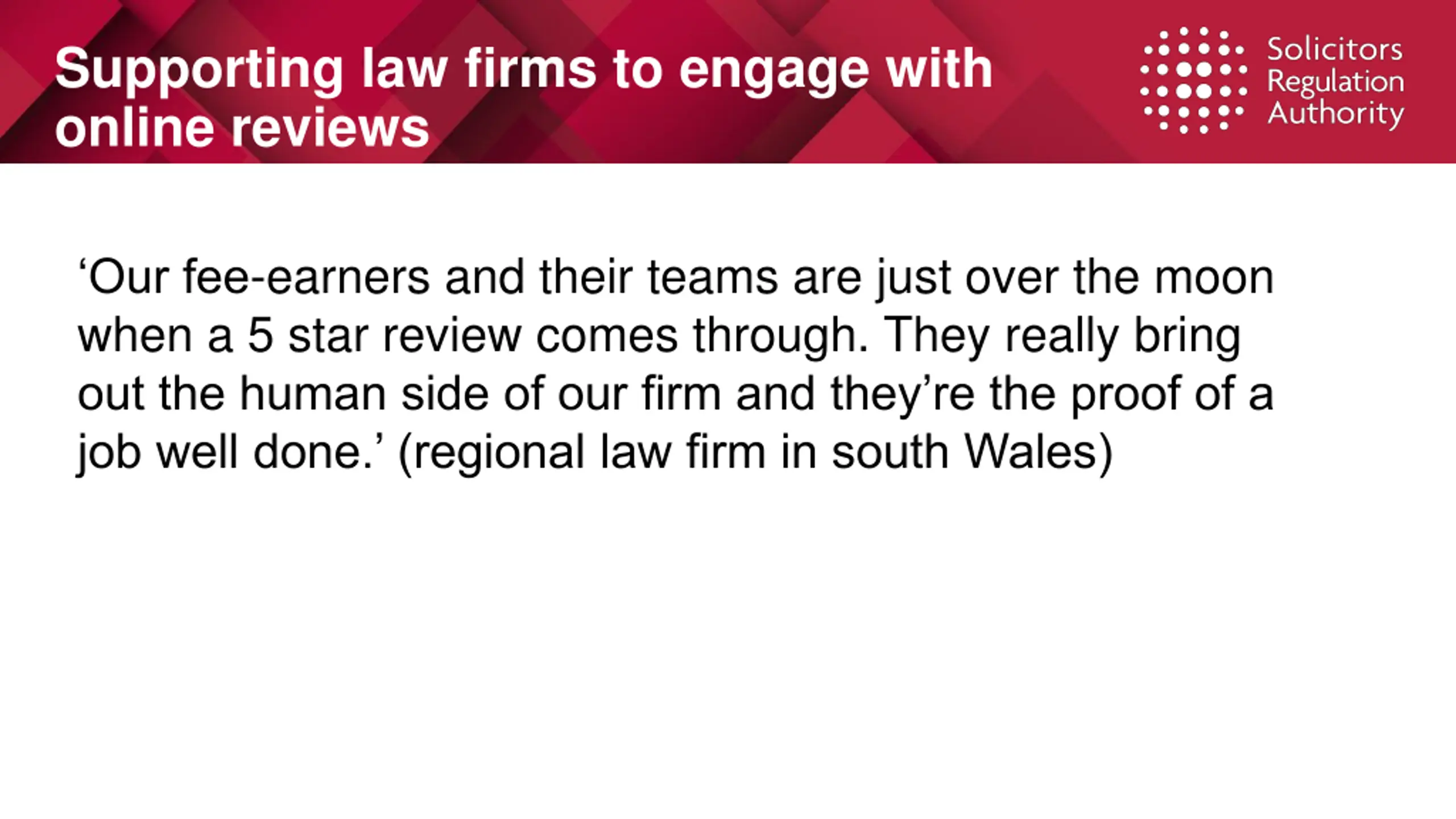 Supporting law firms to engage with online reviews New guidance for firms on engaging with online reviews Webinars to discuss the opportunities and address concerns Dialogue with firms about their experience of online client feedback