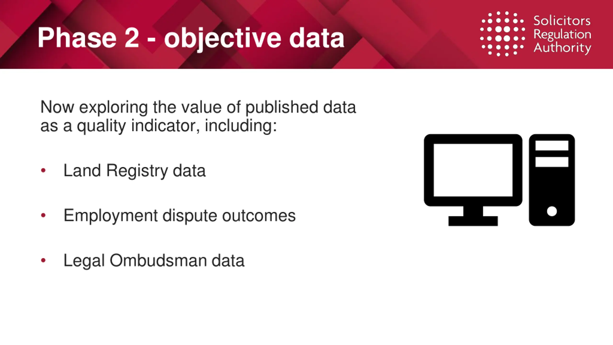 Phase 2 - objective data Now exploring the value of published data as a quality indicator, including: Land Registry data Employment dispute outcomes Legal Ombudsman data