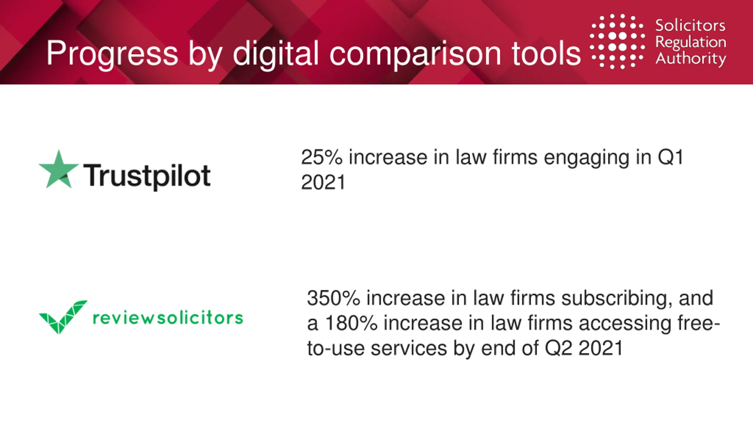Progress by digital comparison tools 25% increase in law firms engaging in Q1 2021 350% increase in law firms subscribing, and a 180% increase in law firms accessing free- to-use services by end of Q2 2021