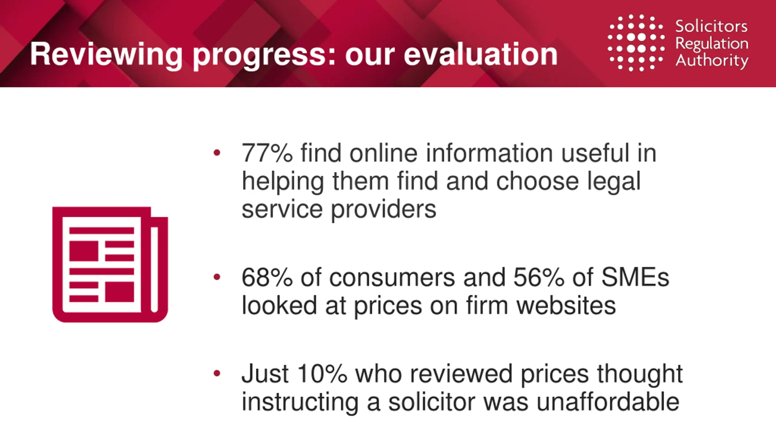 Reviewing progress: our evaluation 77% find online information useful in helping them find and choose legal service providers 68% of consumers and 56% of SMEs looked at prices on firm websites Just 10% who reviewed prices thought instructing a solicitor was unaffordable