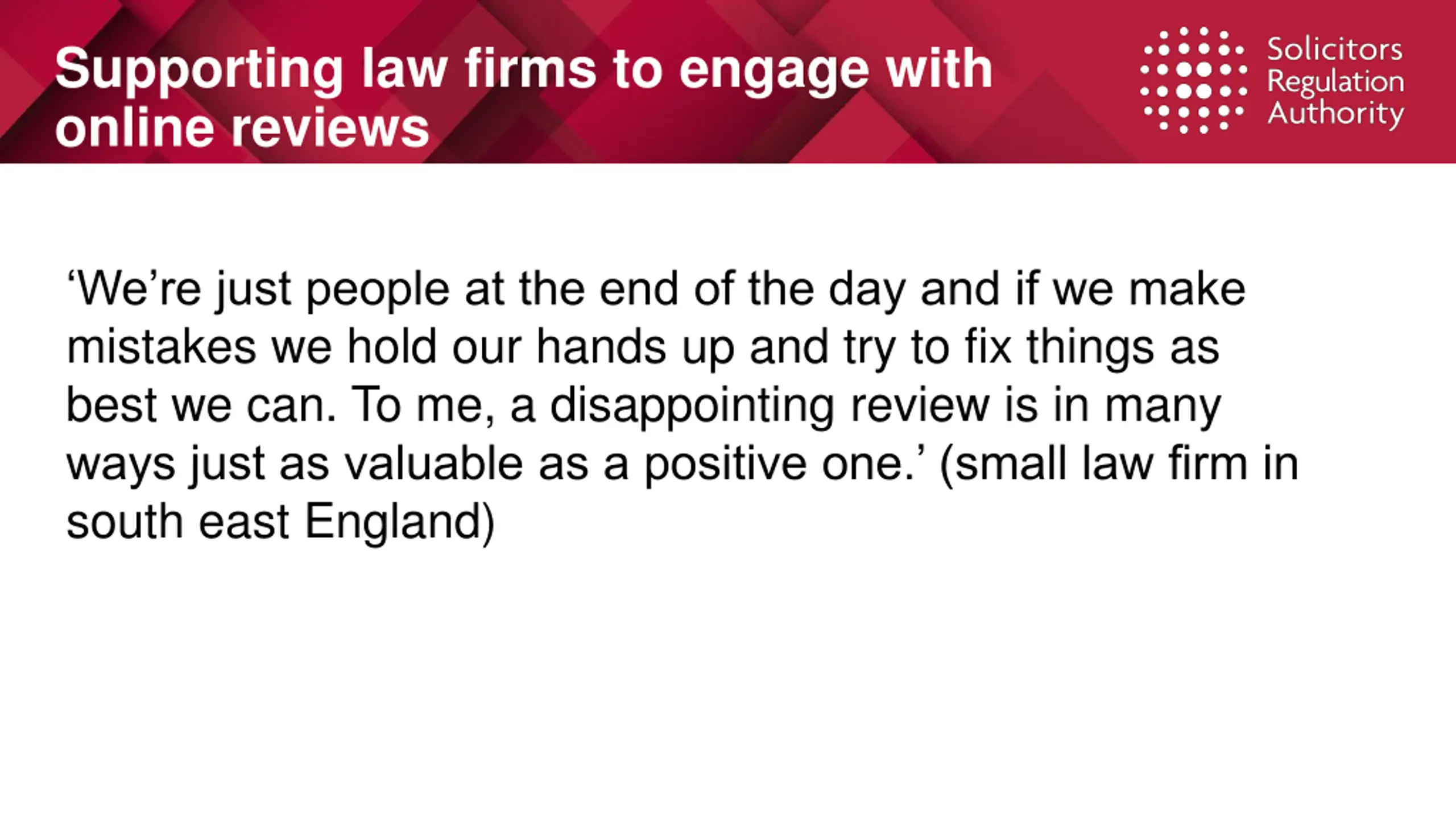 Supporting law firms to engage with online reviews We re just people at the end of the day and if we make mistakes we hold our hands up and try to fix things as best we can. To me, a disappointing review is in many ways just as valuable as a positive one. (small law firm in south east England)