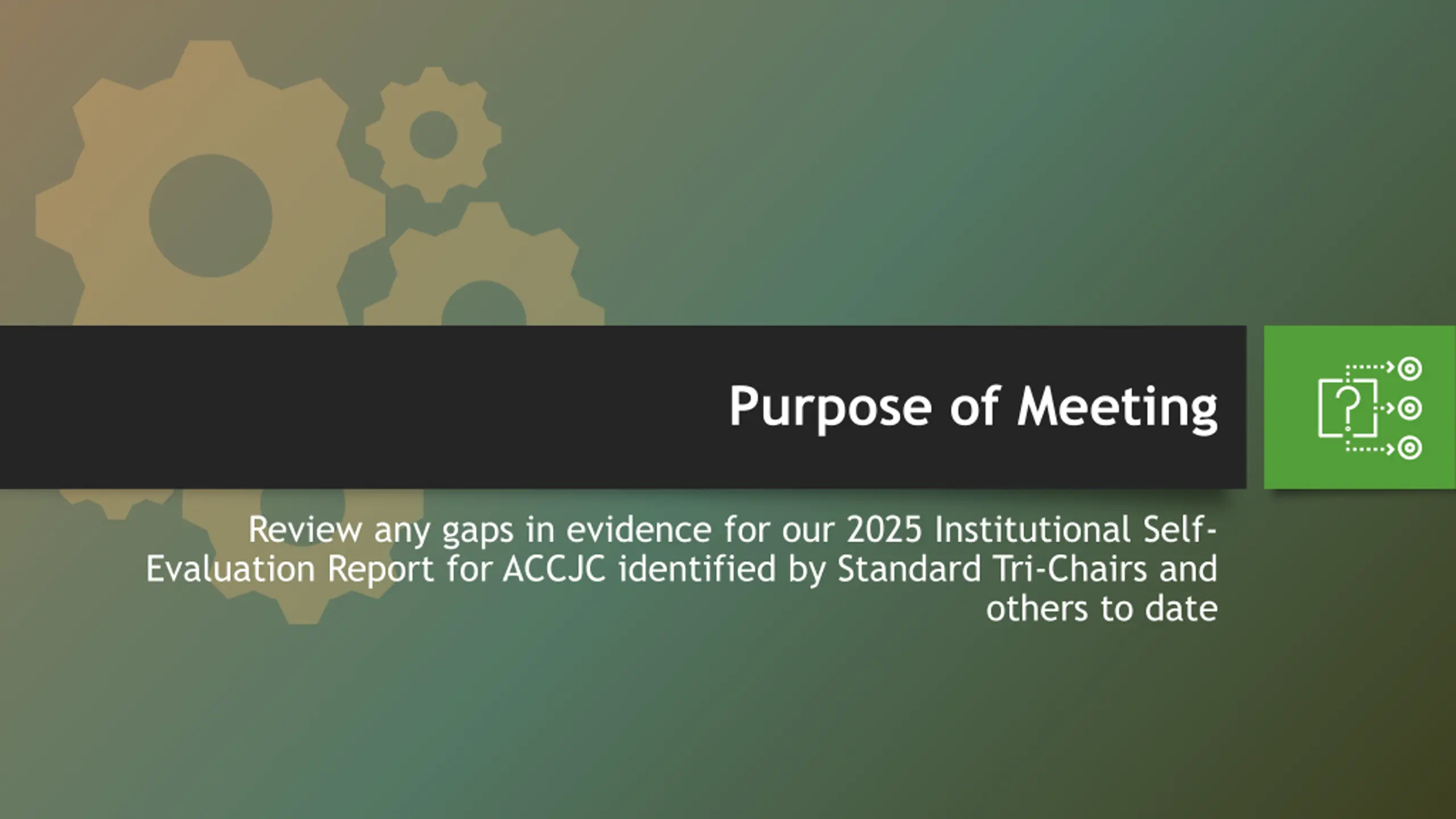 Purpose of Meeting Review any gaps in evidence for our 2025 Institutional Self- Evaluation Report for ACCJC identified by Standard Tri-Chairs and others to date
