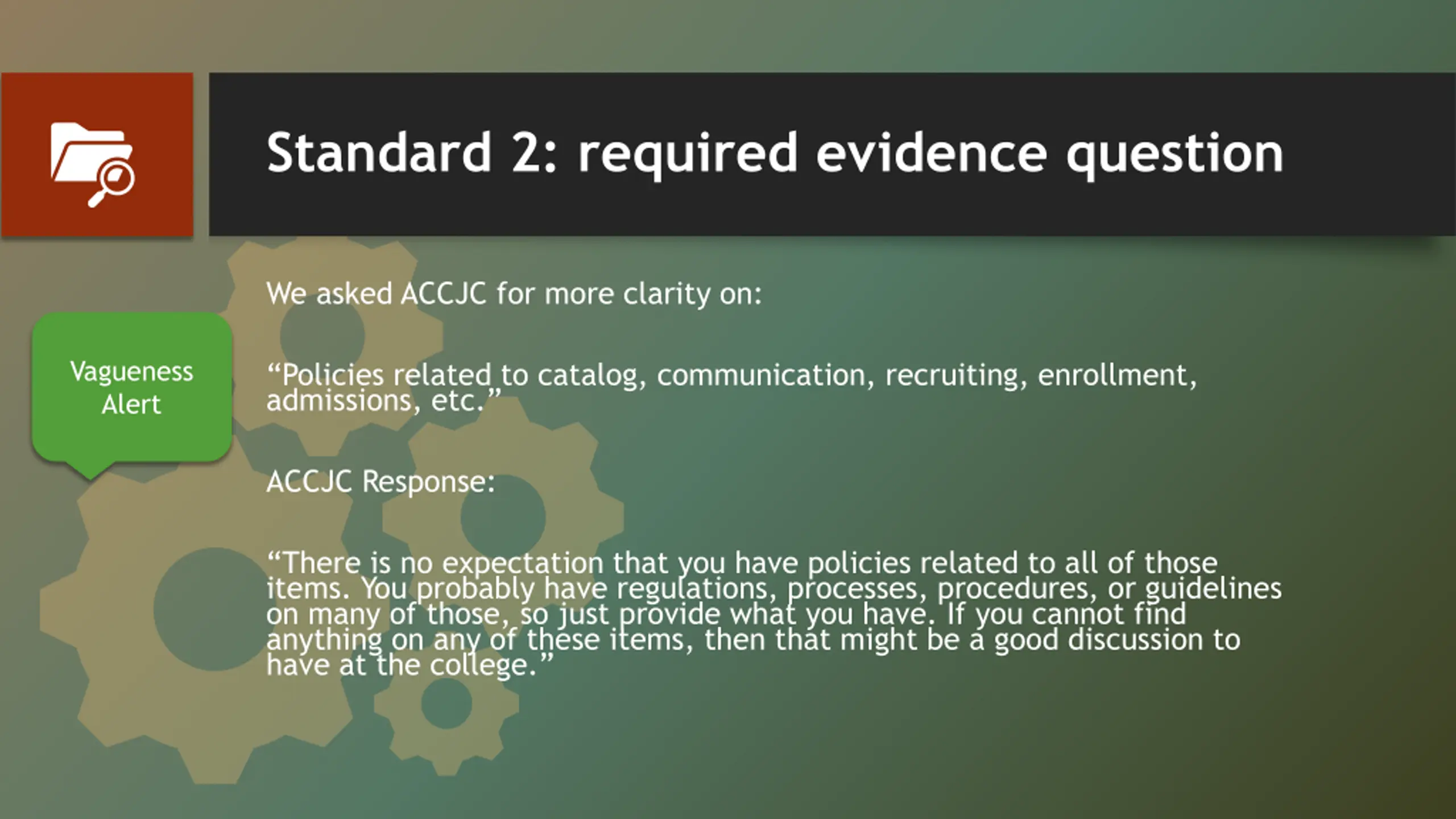 Standard 2: required evidence question We asked ACCJC for more clarity on: Vagueness Alert Policies related to catalog, communication, recruiting, enrollment, admissions, etc. ACCJC Response: There is no expectation that you have policies related to all of those items. You probably have regulations, processes, procedures, or guidelines on many of those, so just provide what you have. If you cannot find anything on any of these items, then that might be a good discussion to have at the college.