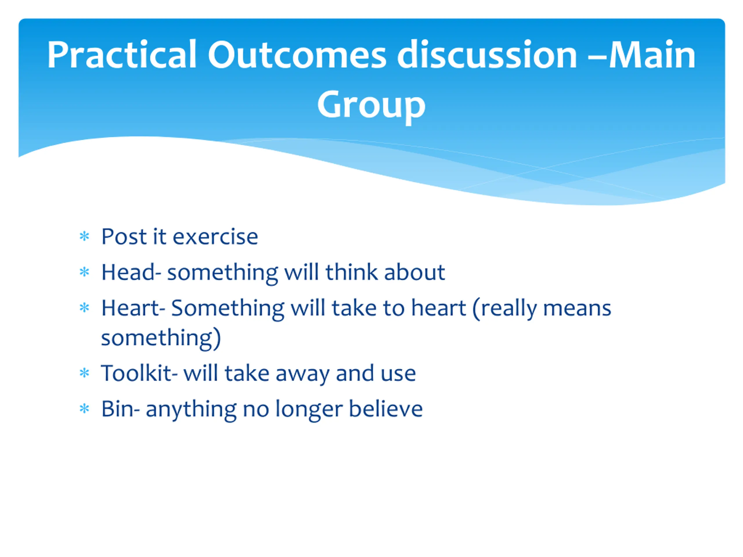 Practical Outcomes discussion Main Group Post it exercise Head- something will think about Heart- Something will take to heart (really means something) Toolkit- will take away and use Bin- anything no longer believe