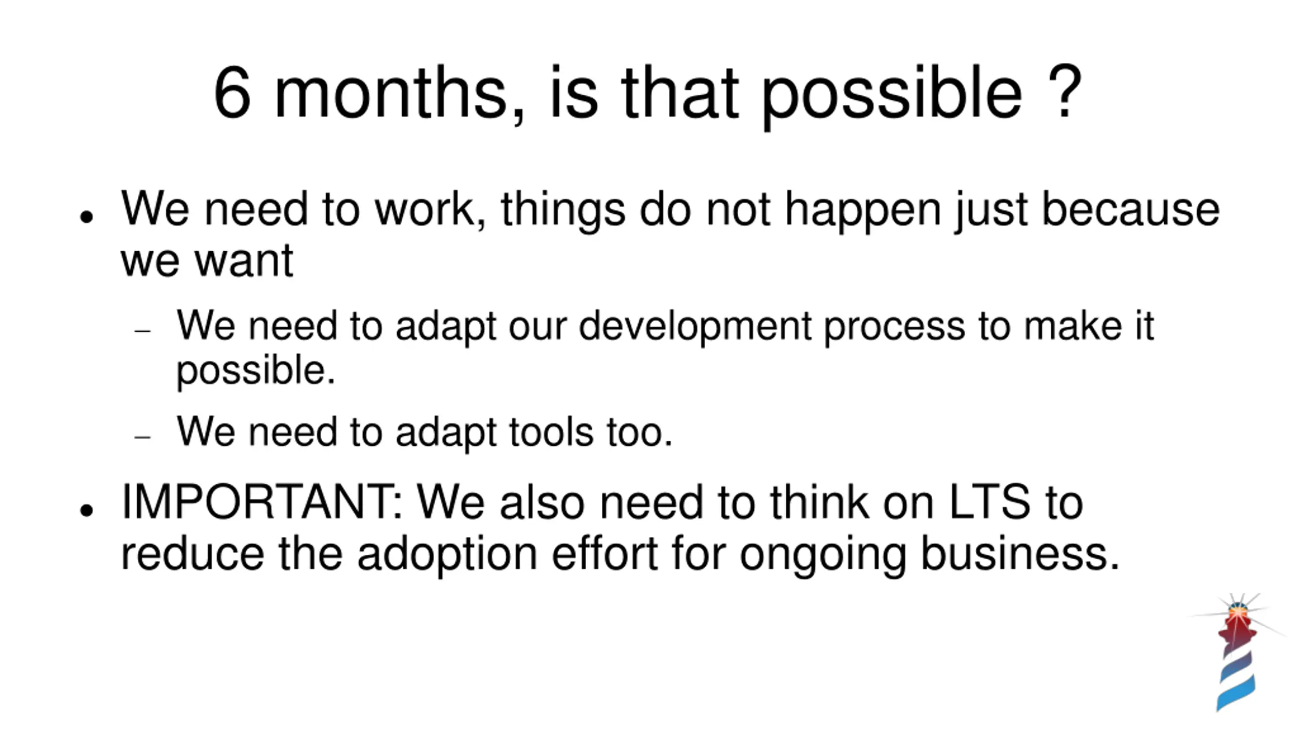 6 months, is that possible ? We need to work, things do not happen just because we want We need to adapt our development process to make it possible. We need to adapt tools too. IMPORTANT: We also need to think on LTS to reduce the adoption effort for ongoing business.