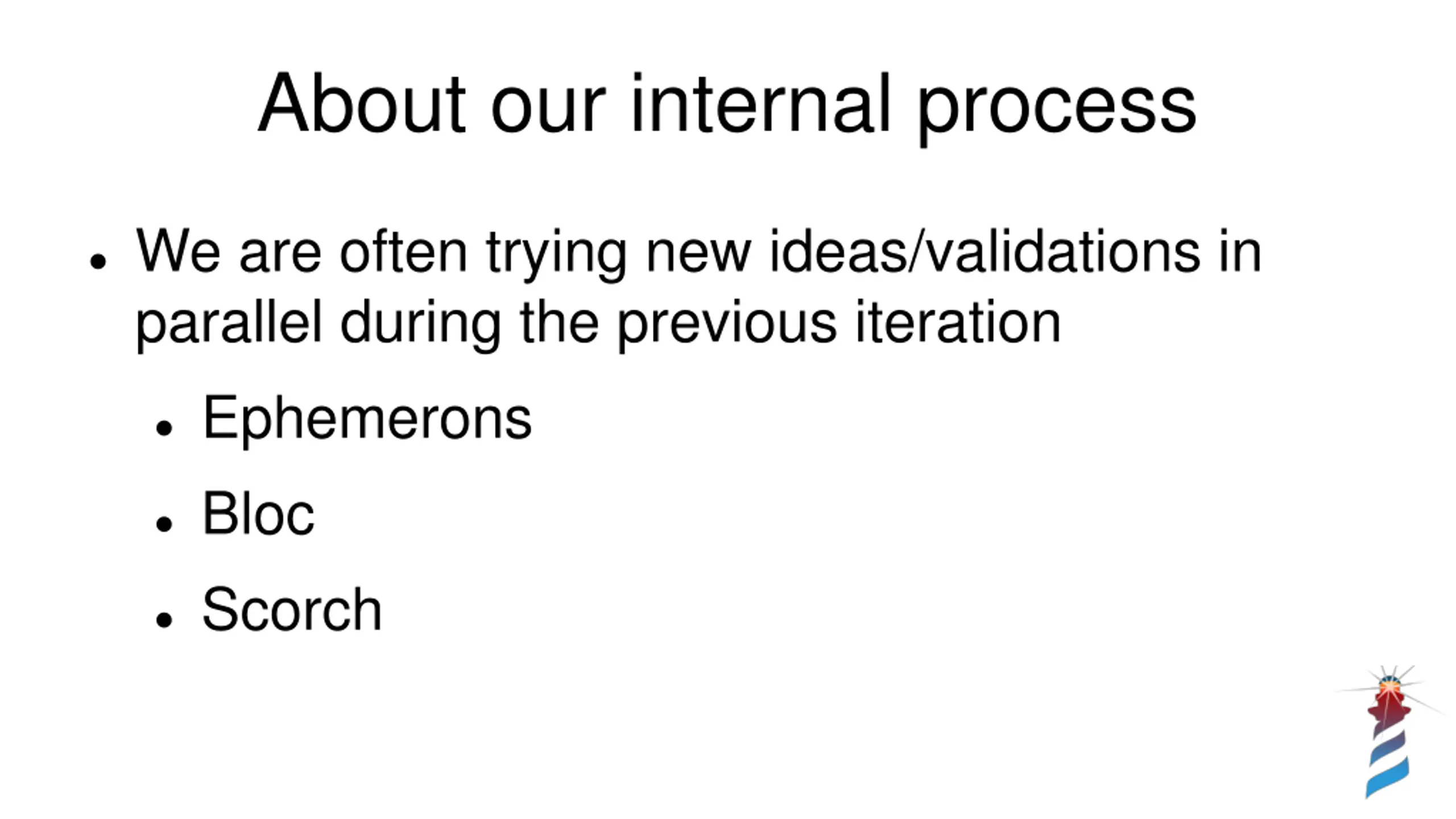 About our internal process We are often trying new ideas/validations in parallel during the previous iteration Ephemerons Bloc Scorch