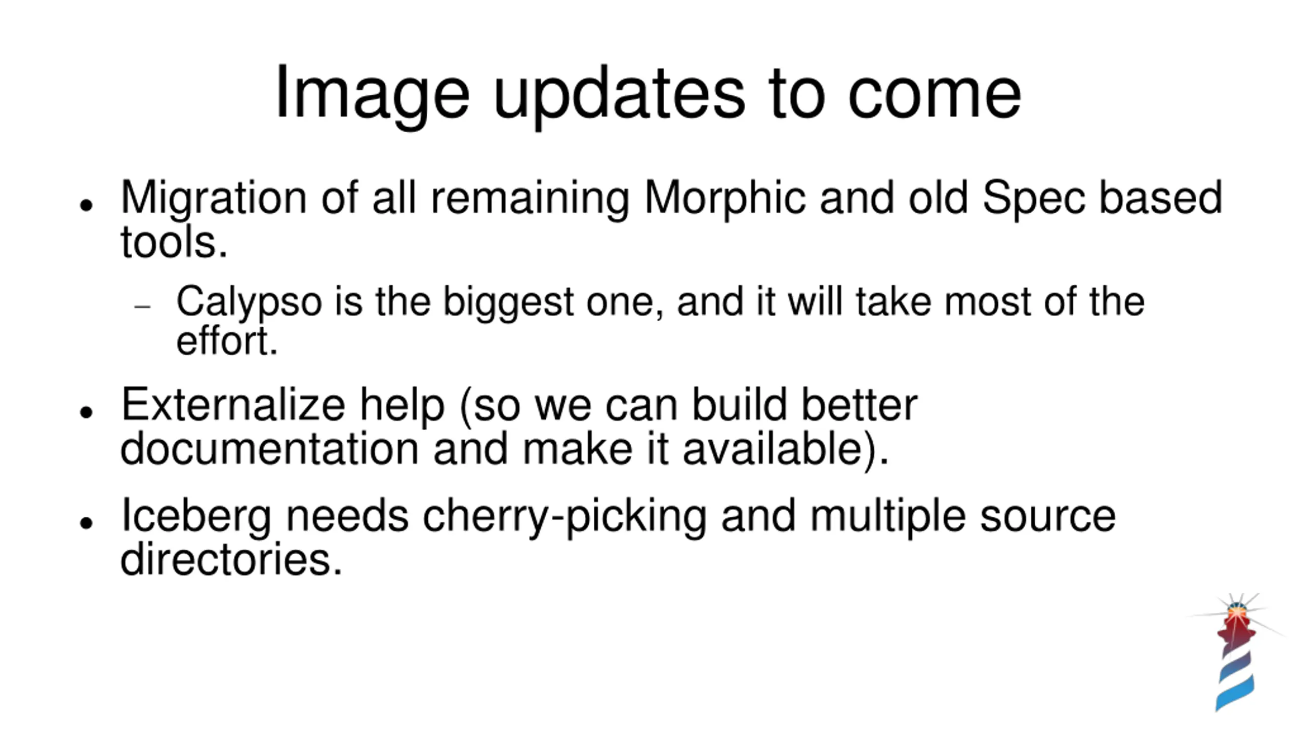 Image updates to come Migration of all remaining Morphic and old Spec based tools. Calypso is the biggest one, and it will take most of the effort. Externalize help (so we can build better documentation and make it available). Iceberg needs cherry-picking and multiple source directories.