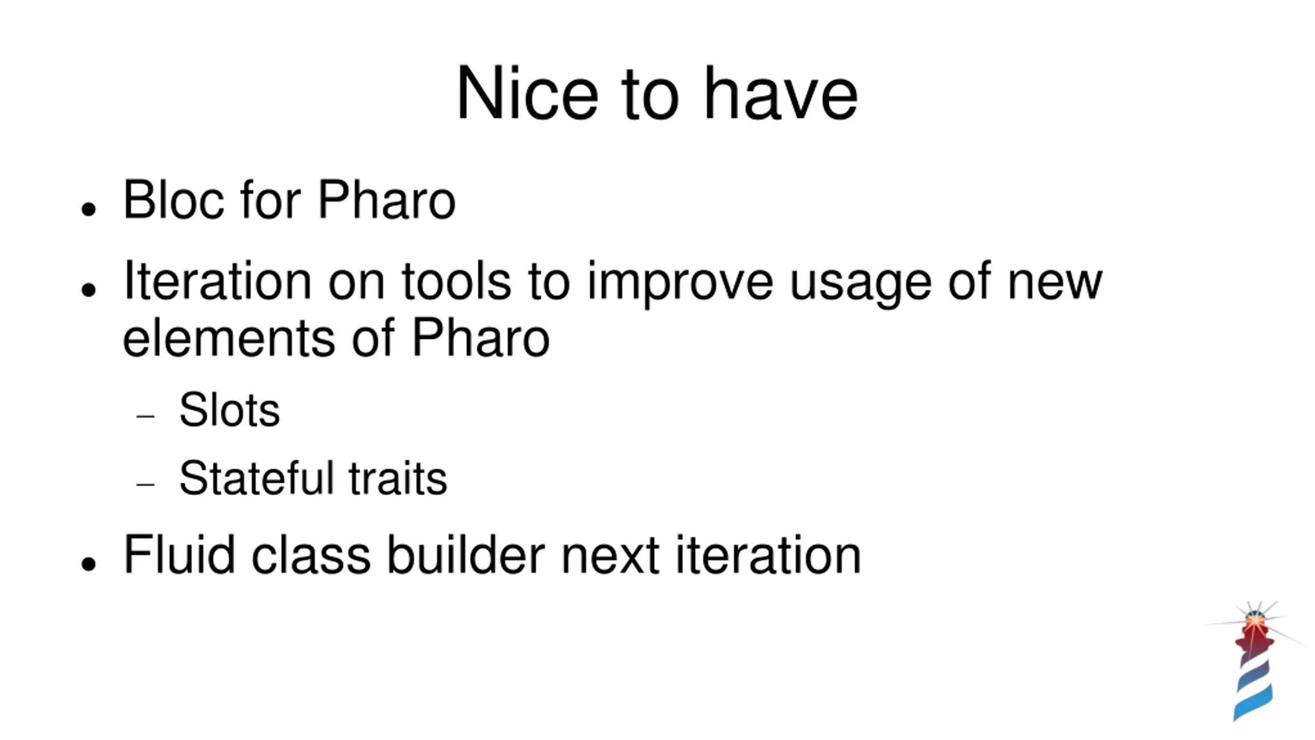 Nice to have Bloc for Pharo Iteration on tools to improve usage of new elements of Pharo Slots Stateful traits Fluid class builder next iteration