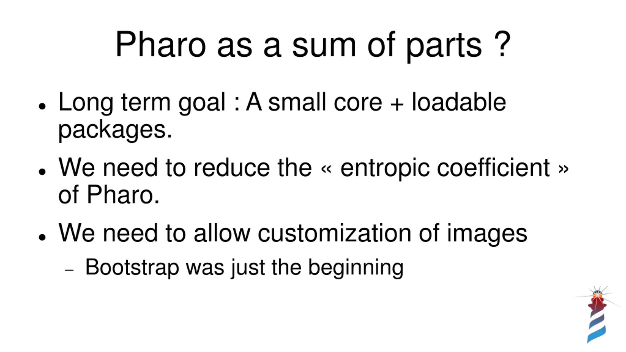 Pharo as a sum of parts ? Long term goal : A small core + loadable packages. We need to reduce the entropic coefficient of Pharo. We need to allow customization of images Bootstrap was just the beginning