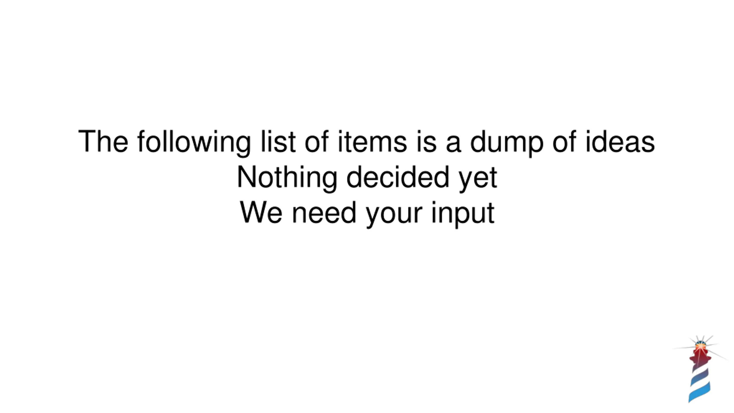 The following list of items is a dump of ideas Nothing decided yet We need your input