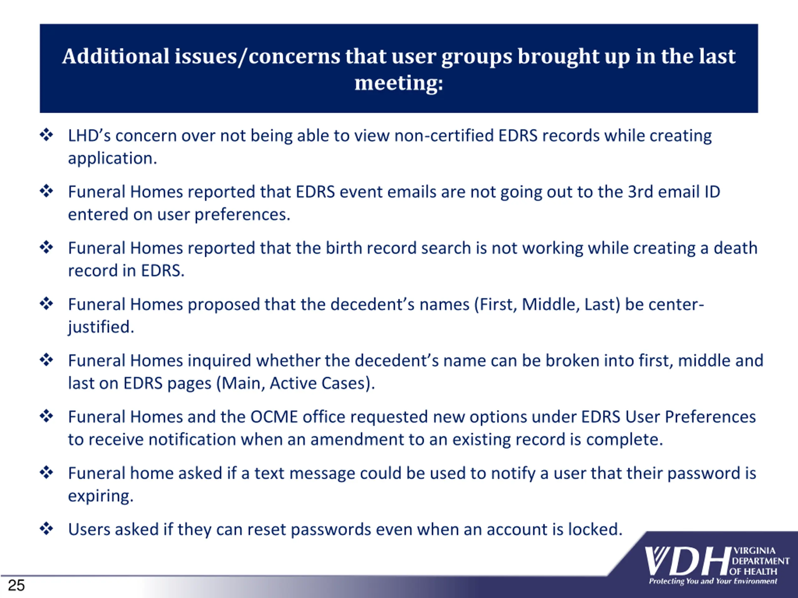 Additional issues/concerns that user groups brought up in the last meeting: LHD s concern over not being able to view non-certified EDRS records while creating application. Funeral Homes reported that EDRS event emails are not going out to the 3rd email ID entered on user preferences. Funeral Homes reported that the birth record search is not working while creating a death record in EDRS. Funeral Homes proposed that the decedent s names (First, Middle, Last) be center- justified. Funeral Homes inquired whether the decedent s name can be broken into first, middle and last on EDRS pages (Main, Active Cases). Funeral Homes and the OCME office requested new options under EDRS User Preferences to receive notification when an amendment to an existing record is complete. Funeral home asked if a text message could be used to notify a user that their password is expiring. Users asked if they can reset passwords even when an account is locked. 25