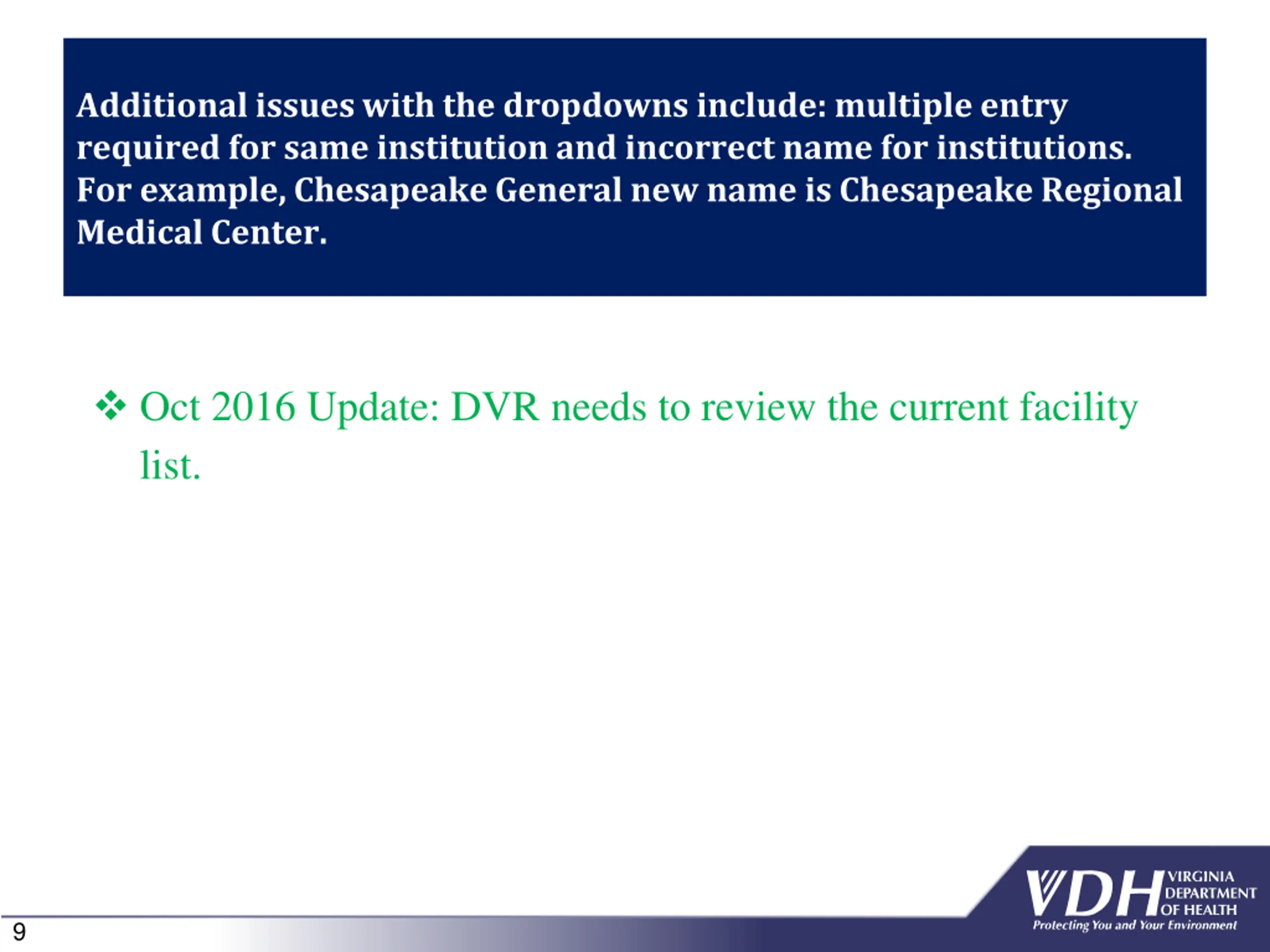 Additional issues with the dropdowns include: multiple entry required for same institution and incorrect name for institutions. For example, Chesapeake General new name is Chesapeake Regional Medical Center. Oct 2016 Update: DVR needs to review the current facility list. 9