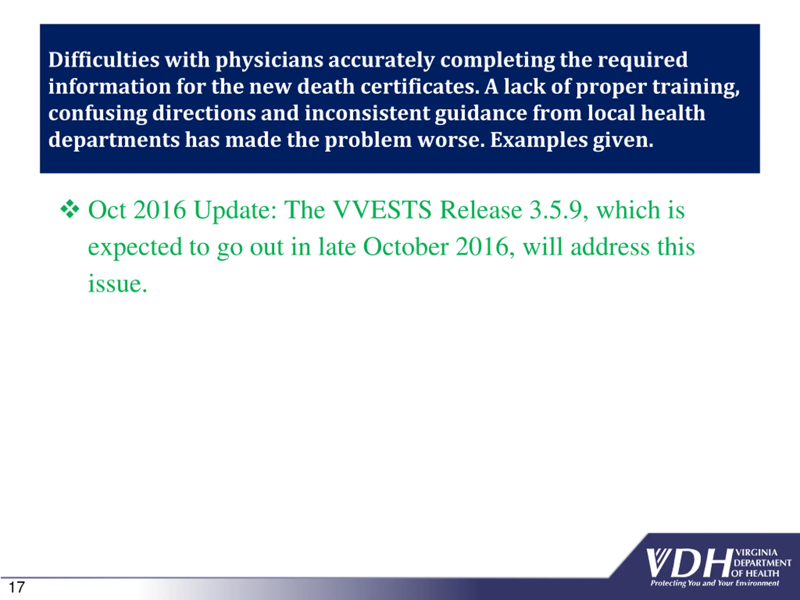 Difficulties with physicians accurately completing the required information for the new death certificates. A lack of proper training, confusing directions and inconsistent guidance from local health departments has made the problem worse. Examples given. Oct 2016 Update: The VVESTS Release 3.5.9, which is expected to go out in late October 2016, will address this issue. 17