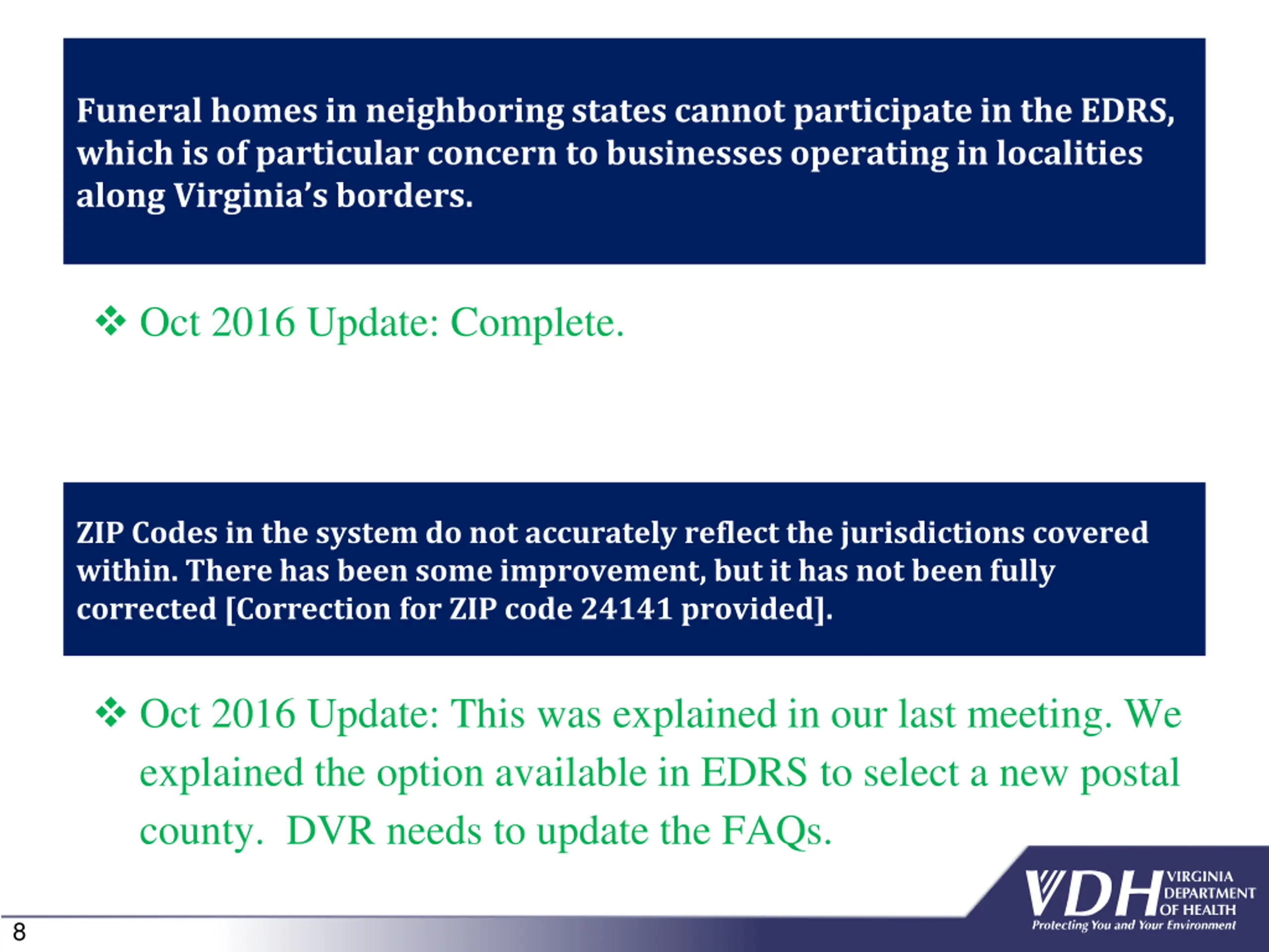 Funeral homes in neighboring states cannot participate in the EDRS, which is of particular concern to businesses operating in localities along Virginia s borders. Oct 2016 Update: Complete. ZIP Codes in the system do not accurately reflect the jurisdictions covered within. There has been some improvement, but it has not been fully corrected [Correction for ZIP code 24141 provided]. Oct 2016 Update: This was explained in our last meeting. We explained the option available in EDRS to select a new postal county. DVR needs to update the FAQs. 8