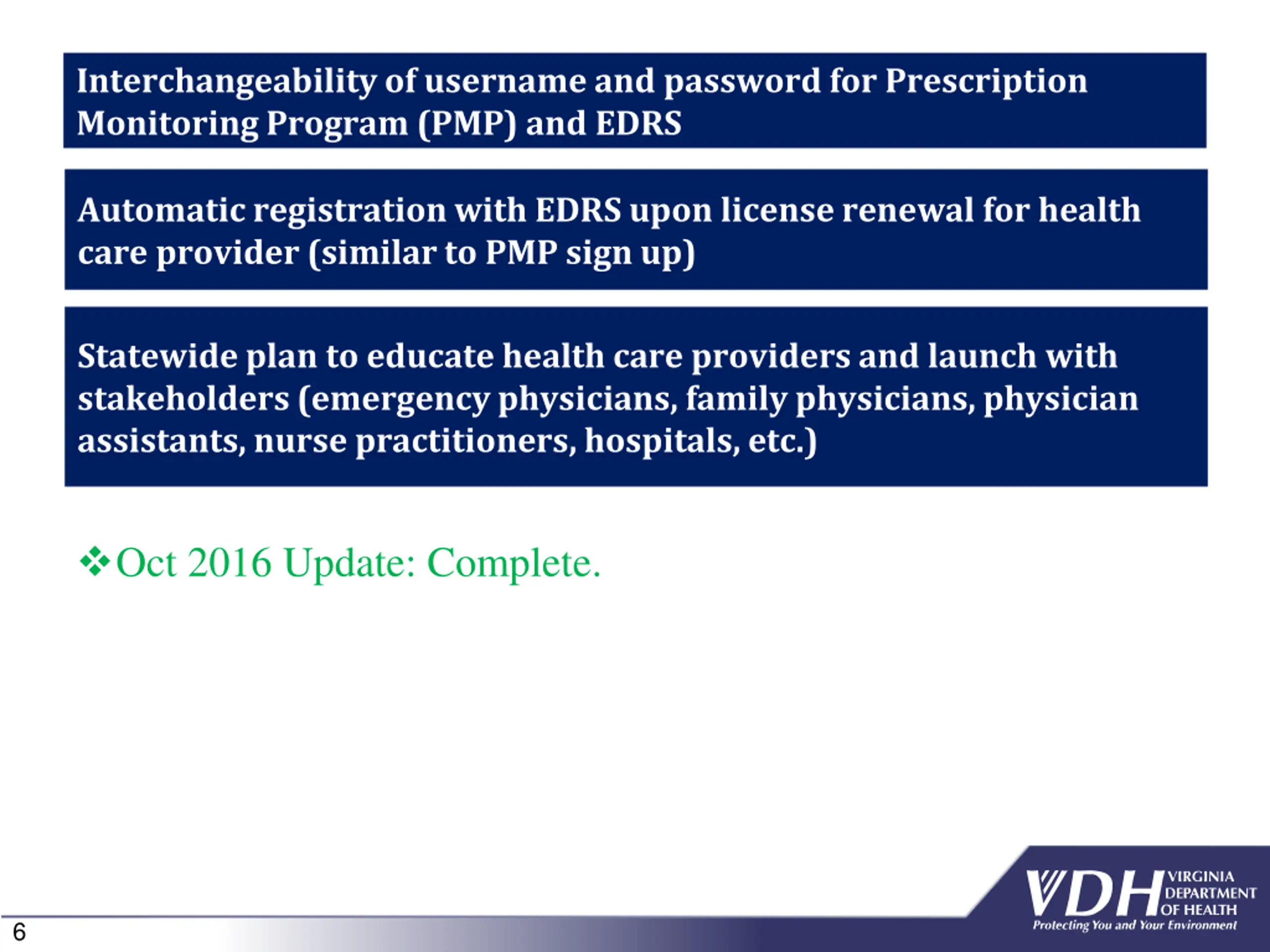 Interchangeability of username and password for Prescription Monitoring Program (PMP) and EDRS Automatic registration with EDRS upon license renewal for health care provider (similar to PMP sign up) Statewide plan to educate health care providers and launch with stakeholders (emergency physicians, family physicians, physician assistants, nurse practitioners, hospitals, etc.) Oct 2016 Update: Complete. 6