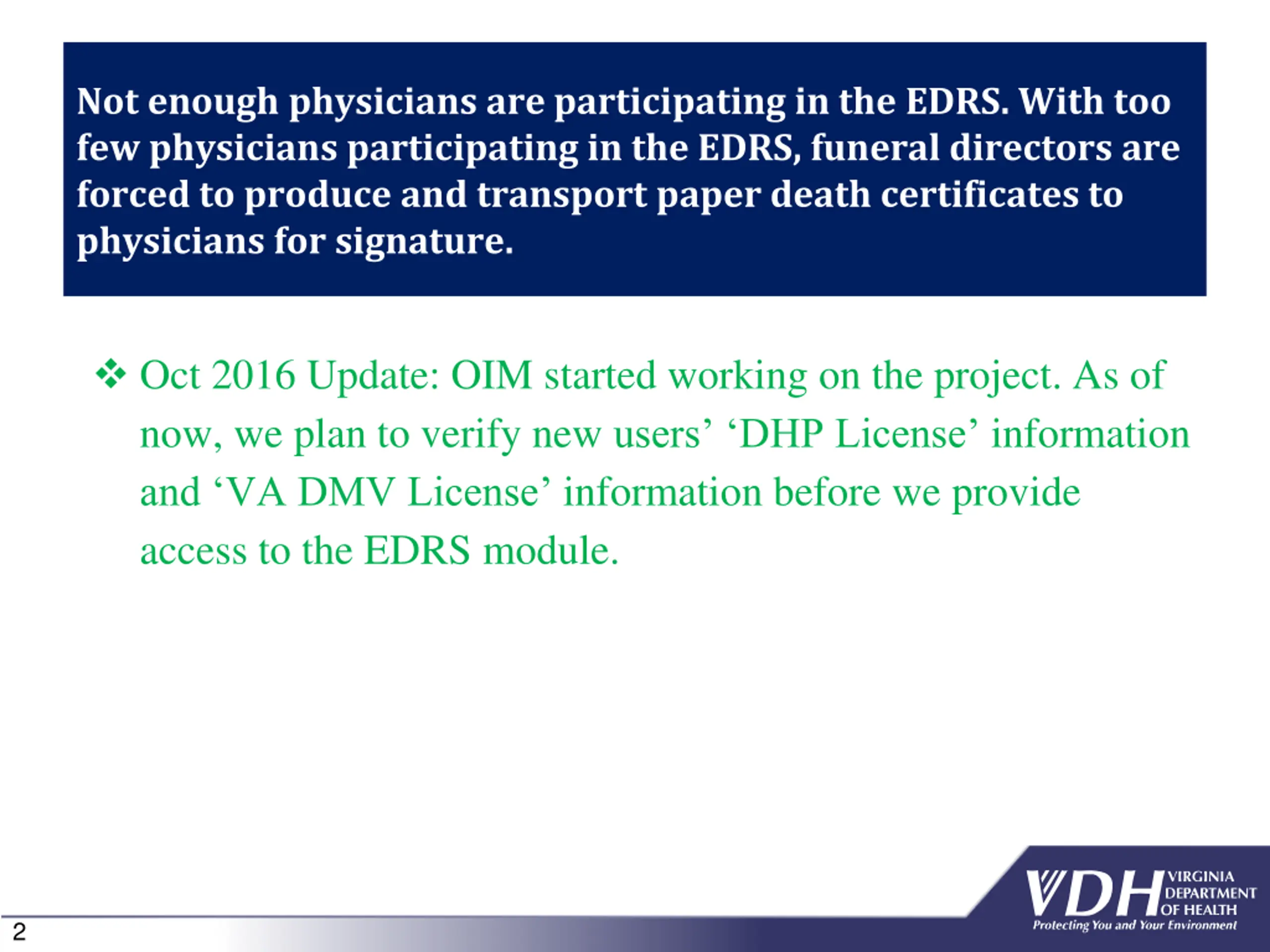 Not enough physicians are participating in the EDRS. With too few physicians participating in the EDRS, funeral directors are forced to produce and transport paper death certificates to physicians for signature. Oct 2016 Update: OIM started working on the project. As of now, we plan to verify new users DHP License information and VA DMV License information before we provide access to the EDRS module. 2