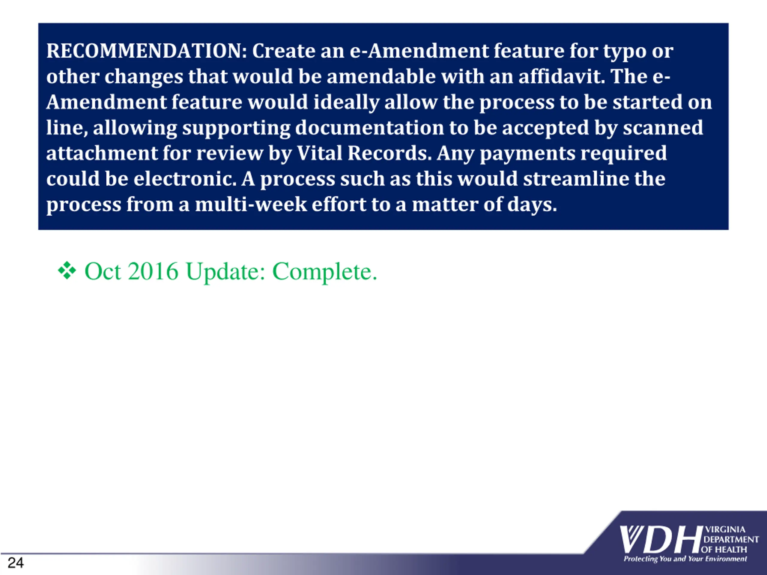 RECOMMENDATION: Create an e-Amendment feature for typo or other changes that would be amendable with an affidavit. The e- Amendment feature would ideally allow the process to be started on line, allowing supporting documentation to be accepted by scanned attachment for review by Vital Records. Any payments required could be electronic. A process such as this would streamline the process from a multi-week effort to a matter of days. Oct 2016 Update: Complete. 24