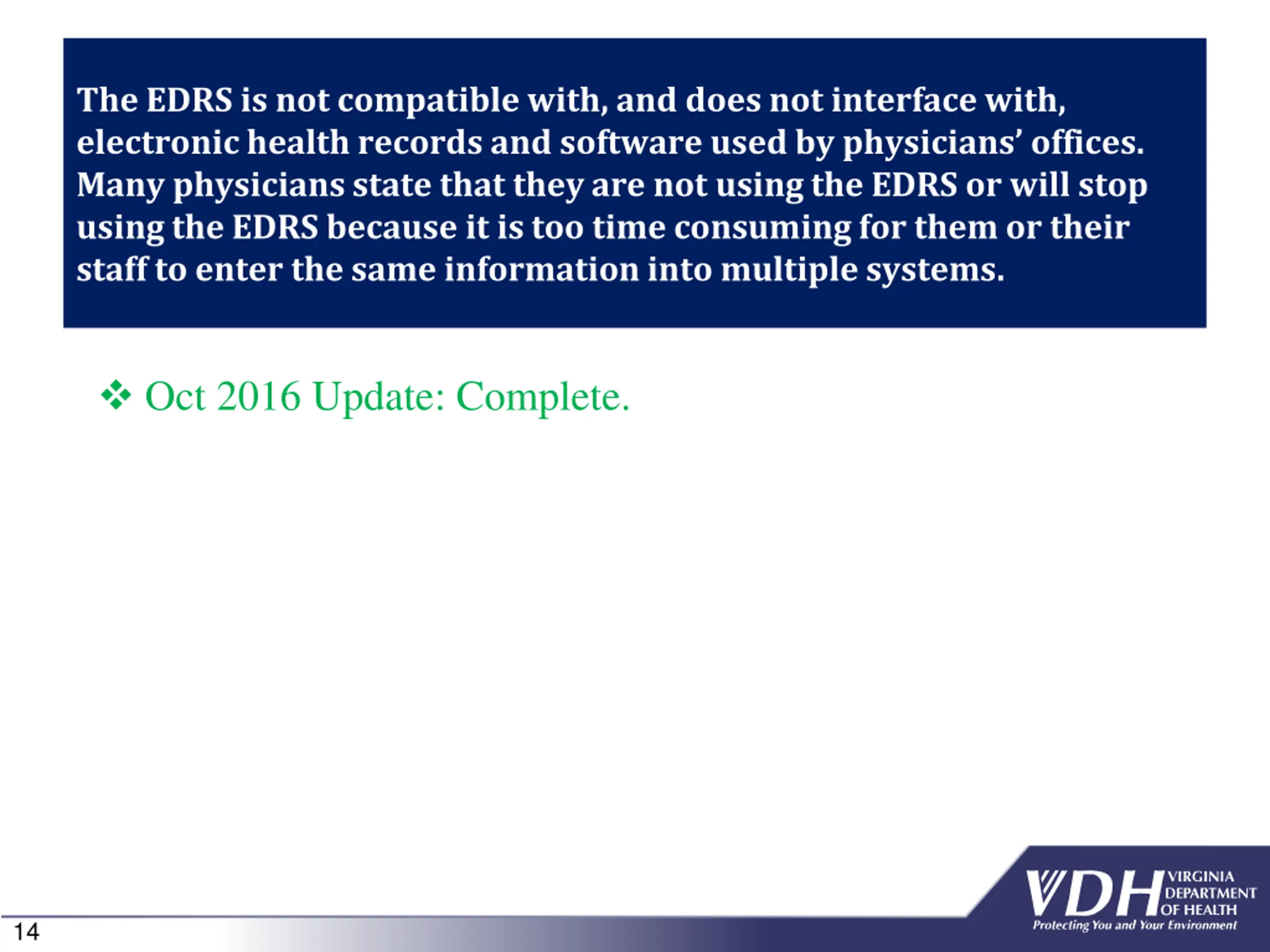 The EDRS is not compatible with, and does not interface with, electronic health records and software used by physicians offices. Many physicians state that they are not using the EDRS or will stop using the EDRS because it is too time consuming for them or their staff to enter the same information into multiple systems. Oct 2016 Update: Complete. 14