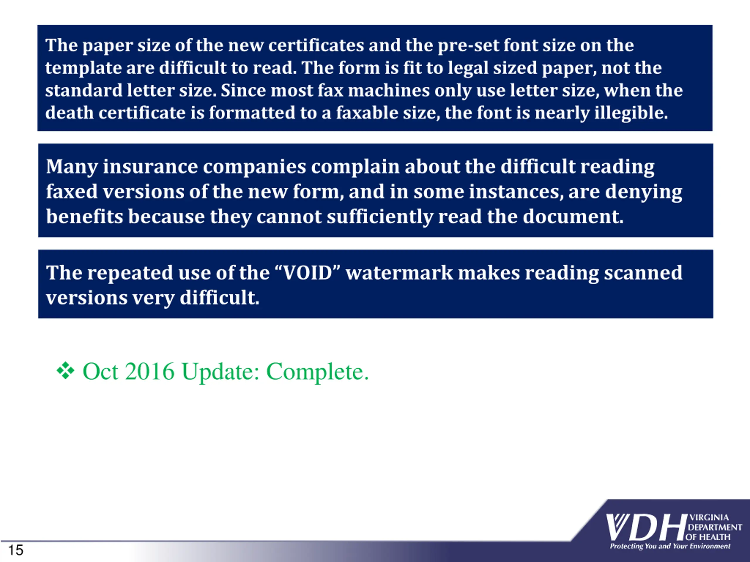 The paper size of the new certificates and the pre-set font size on the template are difficult to read. The form is fit to legal sized paper, not the standard letter size. Since most fax machines only use letter size, when the death certificate is formatted to a faxable size, the font is nearly illegible. Many insurance companies complain about the difficult reading faxed versions of the new form, and in some instances, are denying benefits because they cannot sufficiently read the document. The repeated use of the VOID watermark makes reading scanned versions very difficult. Oct 2016 Update: Complete. 15