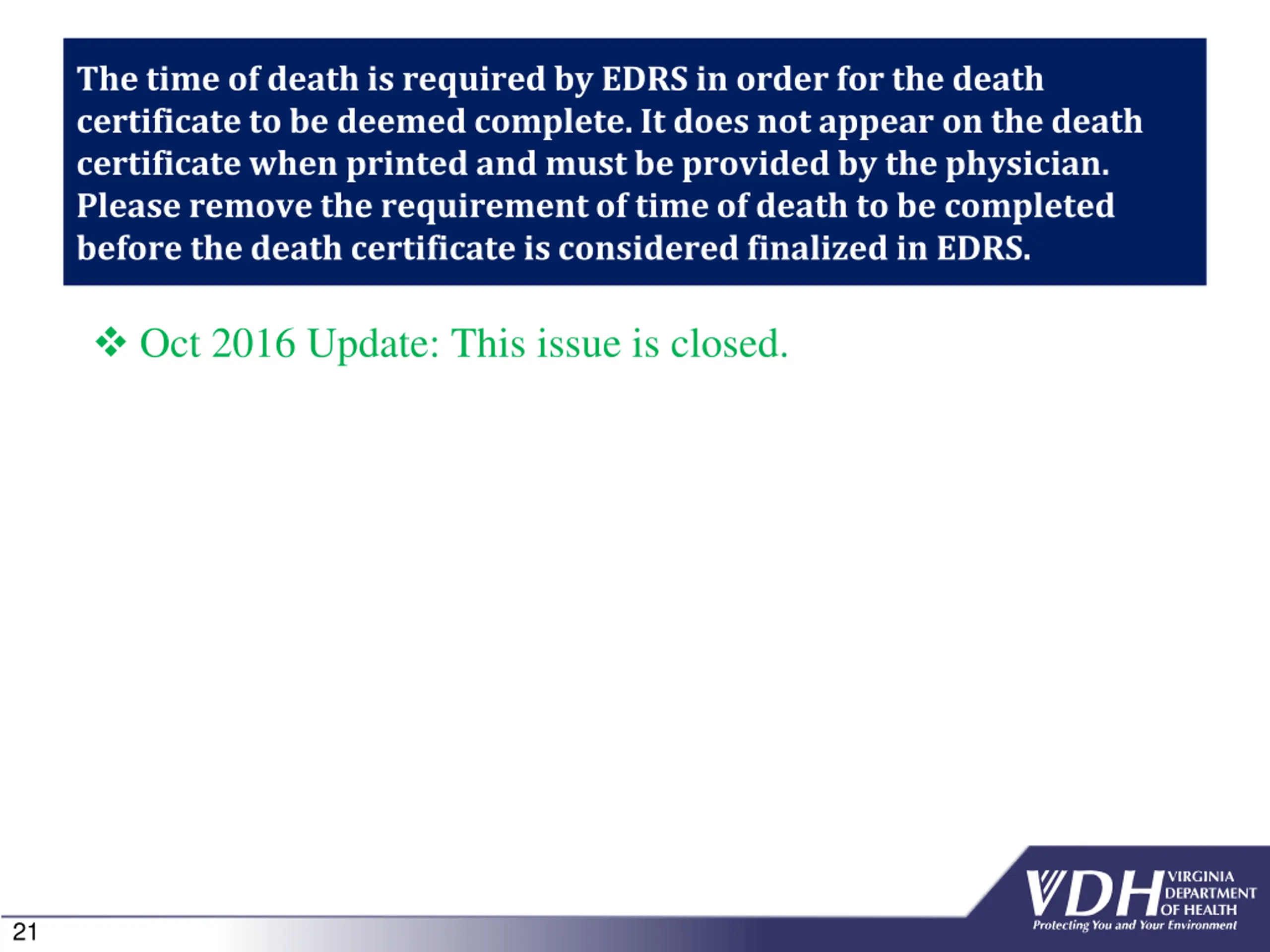 The time of death is required by EDRS in order for the death certificate to be deemed complete. It does not appear on the death certificate when printed and must be provided by the physician. Please remove the requirement of time of death to be completed before the death certificate is considered finalized in EDRS. Oct 2016 Update: This issue is closed. 21