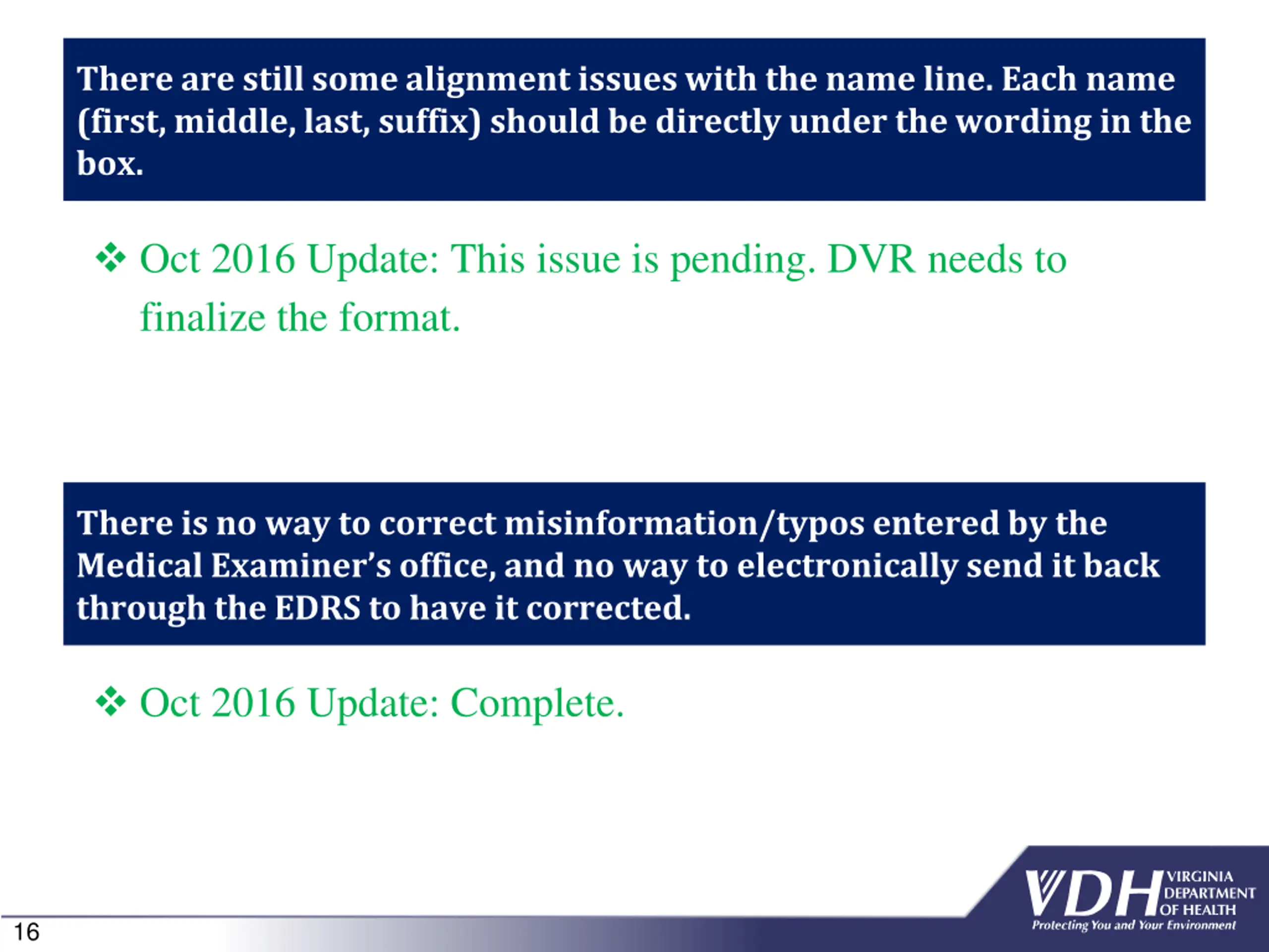 There are still some alignment issues with the name line. Each name (first, middle, last, suffix) should be directly under the wording in the box. Oct 2016 Update: This issue is pending. DVR needs to finalize the format. There is no way to correct misinformation/typos entered by the Medical Examiner s office, and no way to electronically send it back through the EDRS to have it corrected. Oct 2016 Update: Complete. 16