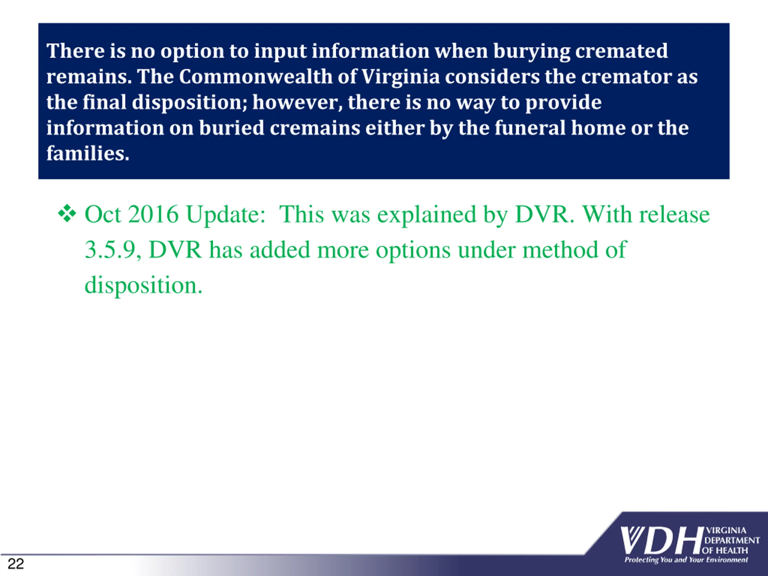 There is no option to input information when burying cremated remains. The Commonwealth of Virginia considers the cremator as the final disposition; however, there is no way to provide information on buried cremains either by the funeral home or the families. Oct 2016 Update: This was explained by DVR. With release 3.5.9, DVR has added more options under method of disposition. 22