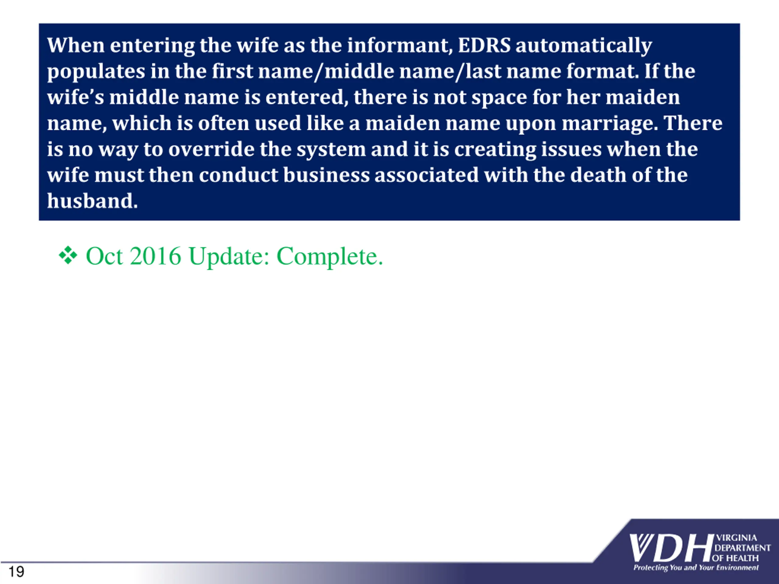When entering the wife as the informant, EDRS automatically populates in the first name/middle name/last name format. If the wife s middle name is entered, there is not space for her maiden name, which is often used like a maiden name upon marriage. There is no way to override the system and it is creating issues when the wife must then conduct business associated with the death of the husband. Oct 2016 Update: Complete. 19