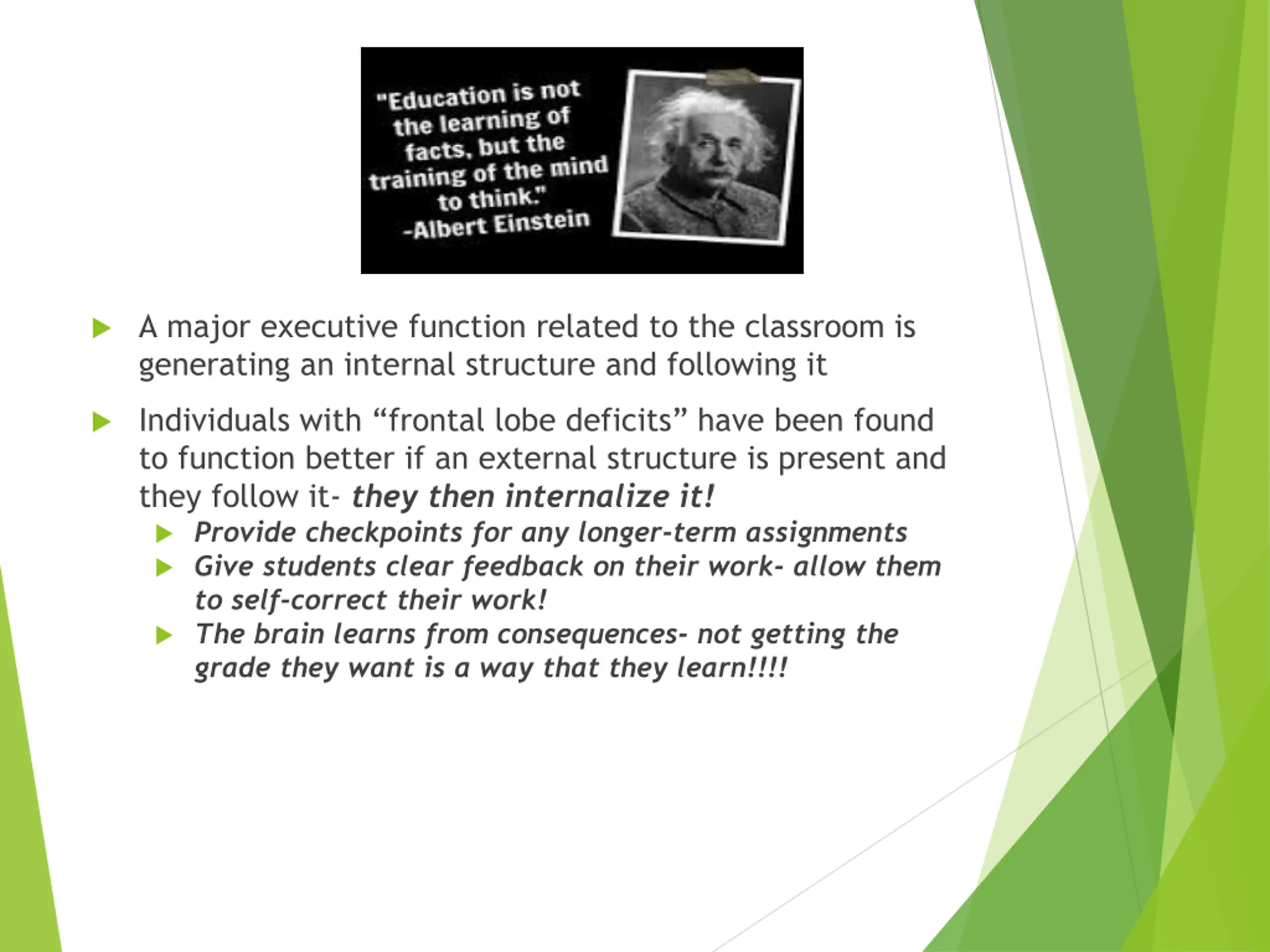 A major executive function related to the classroom is generating an internal structure and following it Individuals with frontal lobe deficits have been found to function better if an external structure is present and they follow it- they then internalize it! Provide checkpoints for any longer-term assignments Give students clear feedback on their work- allow them to self-correct their work! The brain learns from consequences- not getting the grade they want is a way that they learn!!!!