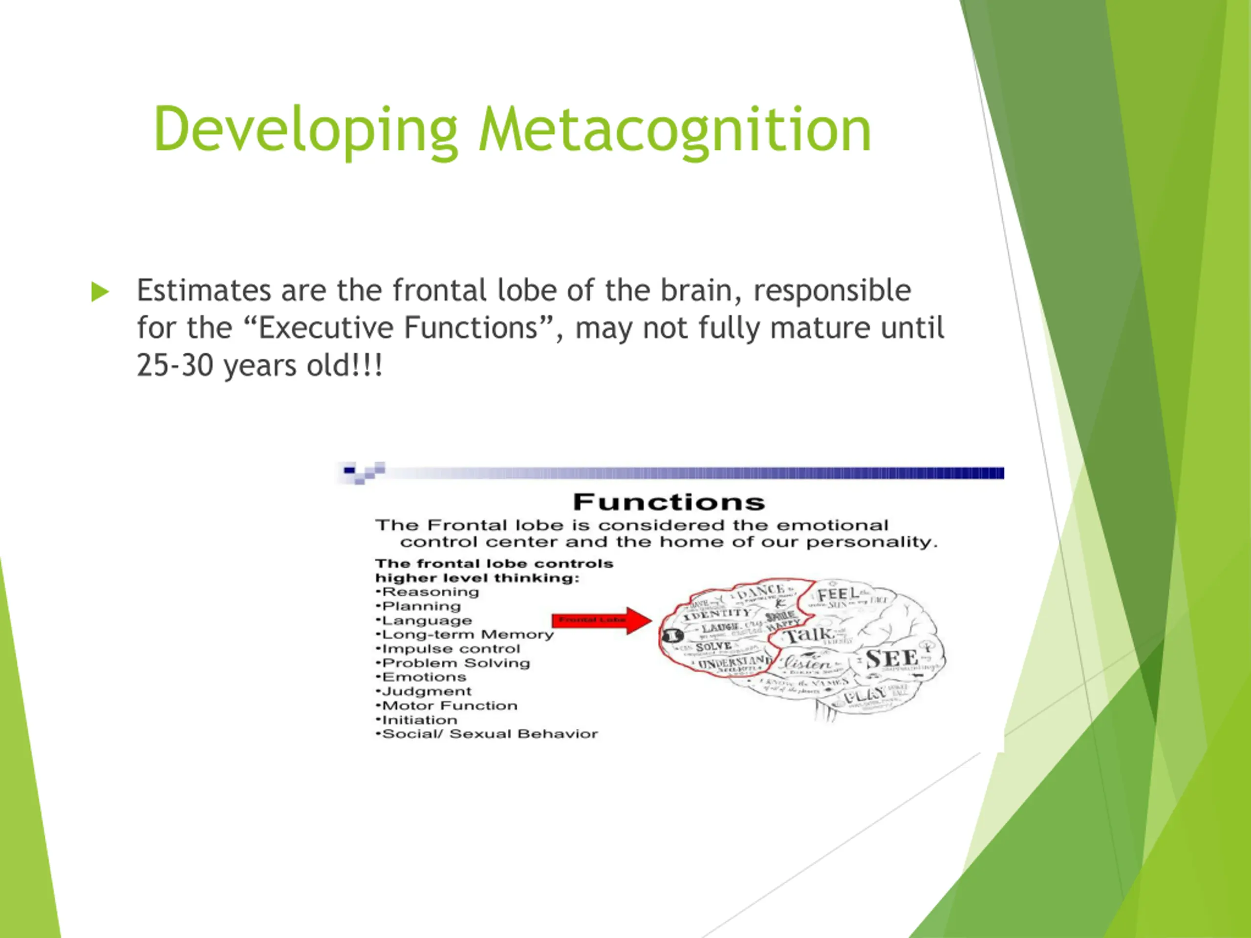 Developing Metacognition Estimates are the frontal lobe of the brain, responsible for the Executive Functions , may not fully mature until 25-30 years old!!!