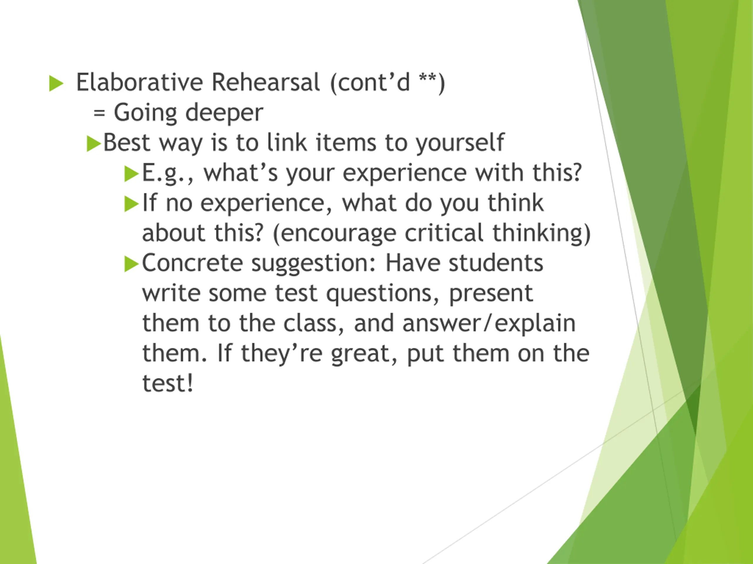 Elaborative Rehearsal (contd **) = Going deeper Best way is to link items to yourself E.g., what s your experience with this? If no experience, what do you think about this? (encourage critical thinking) Concrete suggestion: Have students write some test questions, present them to the class, and answer/explain them. If they re great, put them on the test!