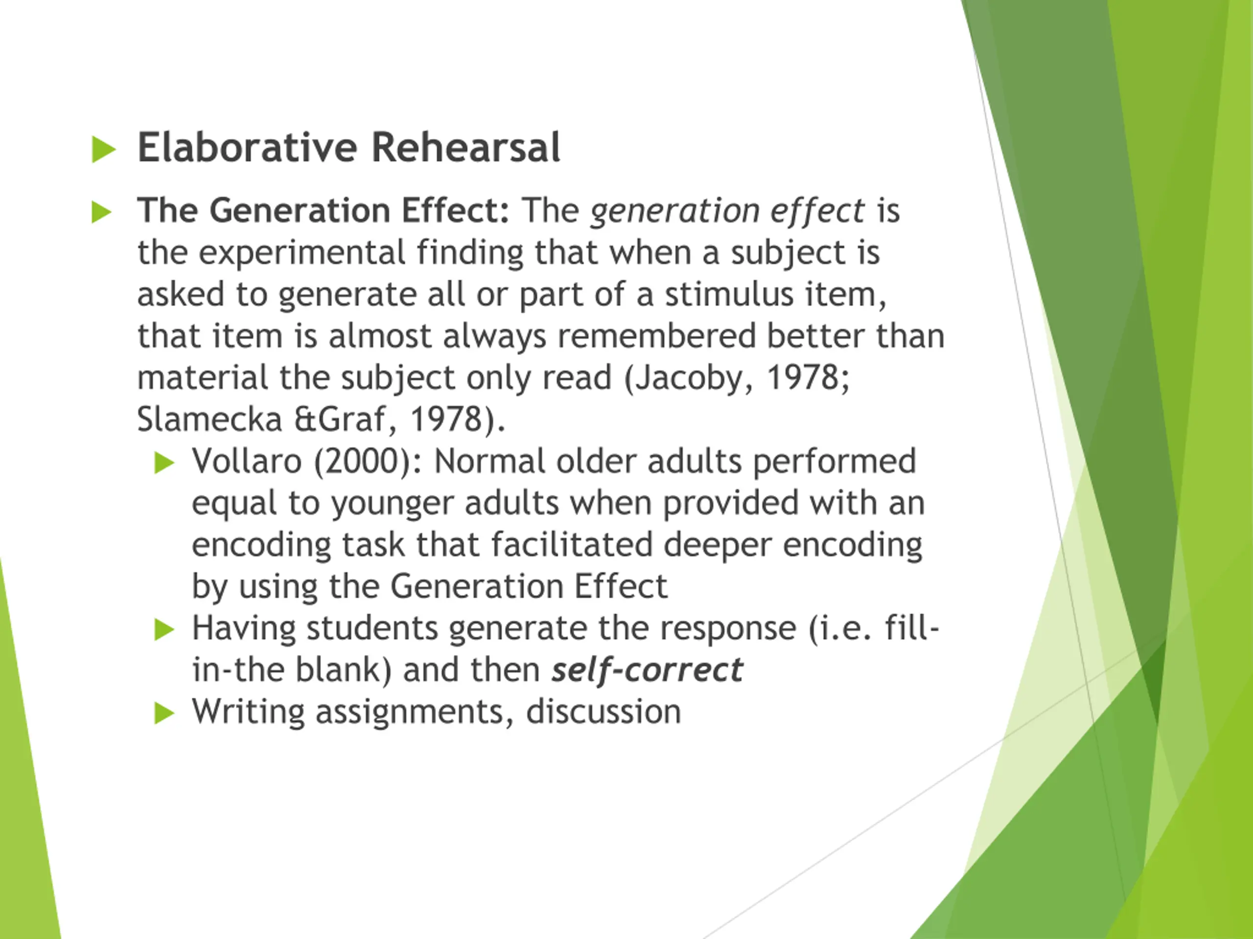 Elaborative Rehearsal The Generation Effect: The generation effect is the experimental finding that when a subject is asked to generate all or part of a stimulus item, that item is almost always remembered better than material the subject only read (Jacoby, 1978; Slamecka &Graf, 1978). Vollaro (2000): Normal older adults performed equal to younger adults when provided with an encoding task that facilitated deeper encoding by using the Generation Effect Having students generate the response (i.e. fill- in-the blank) and then self-correct Writing assignments, discussion