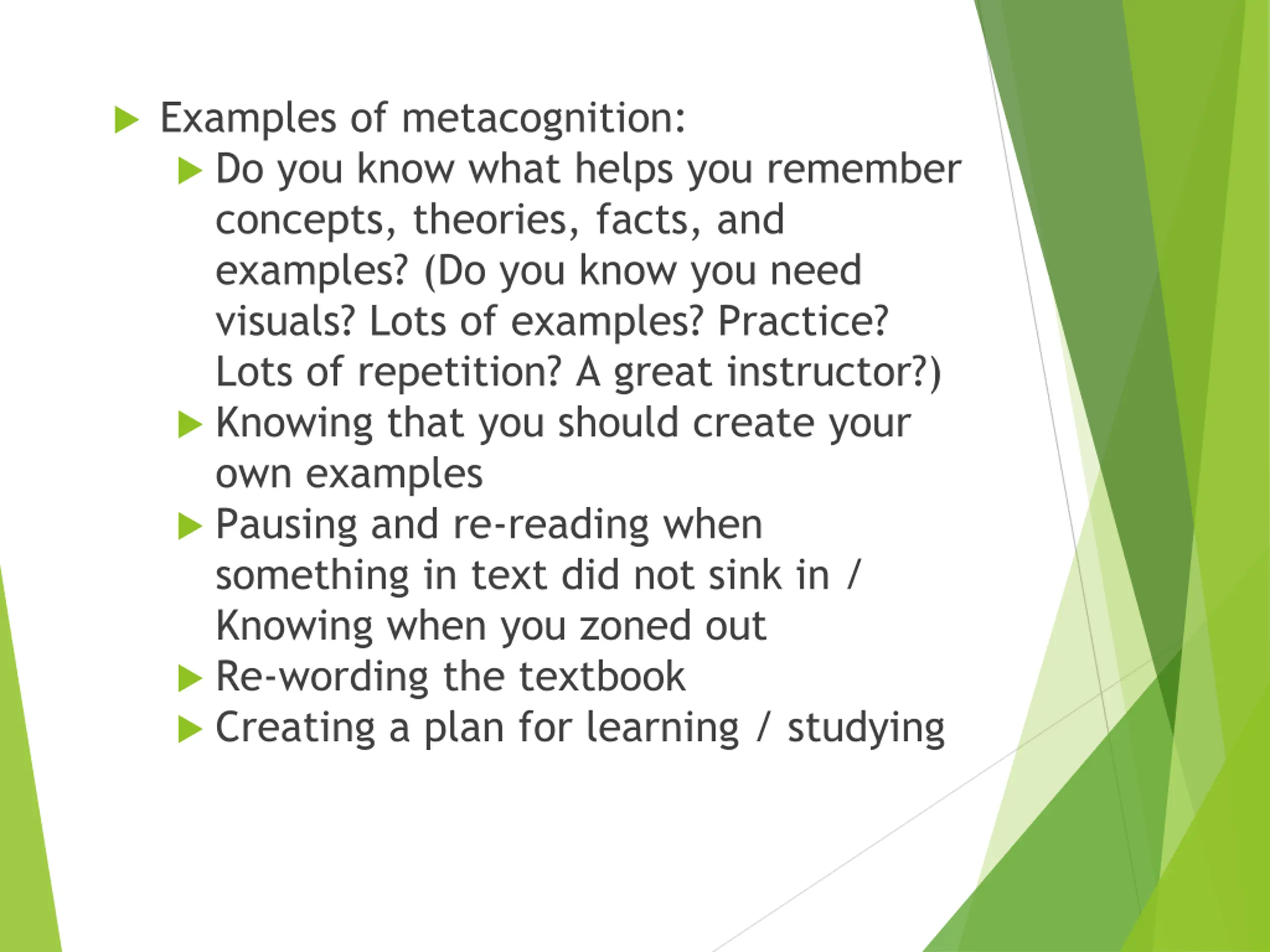 Examples of metacognition: Do you know what helps you remember concepts, theories, facts, and examples? (Do you know you need visuals? Lots of examples? Practice? Lots of repetition? A great instructor?) Knowing that you should create your own examples Pausing and re-reading when something in text did not sink in / Knowing when you zoned out Re-wording the textbook Creating a plan for learning / studying