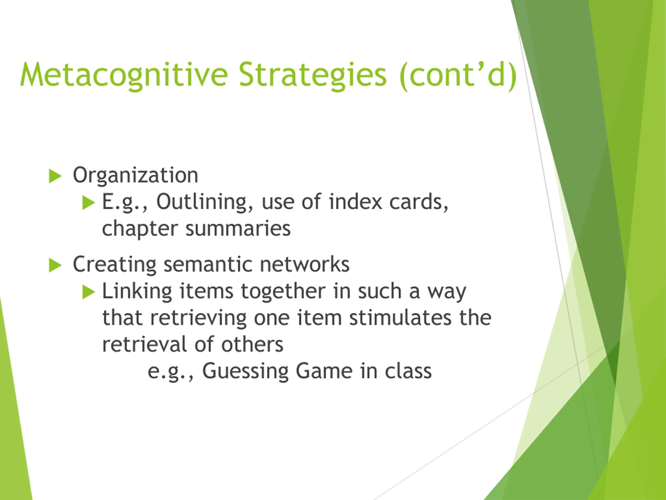 Metacognitive Strategies (contd) Organization E.g., Outlining, use of index cards, chapter summaries Creating semantic networks Linking items together in such a way that retrieving one item stimulates the retrieval of others e.g., Guessing Game in class